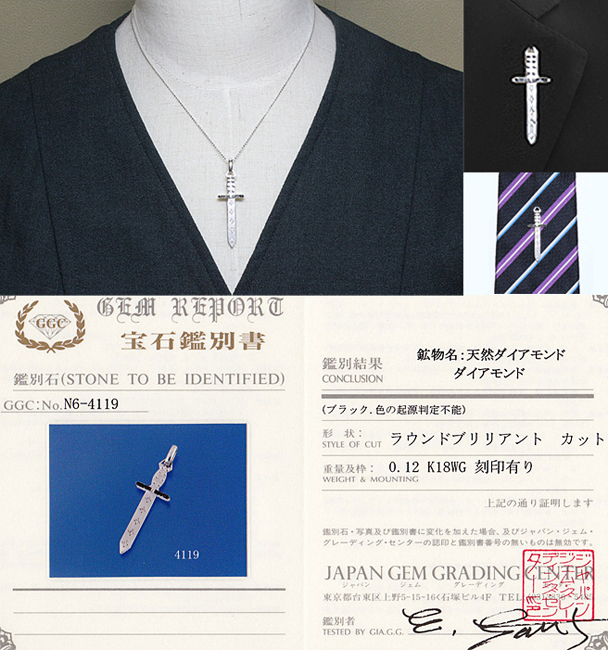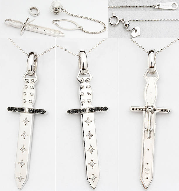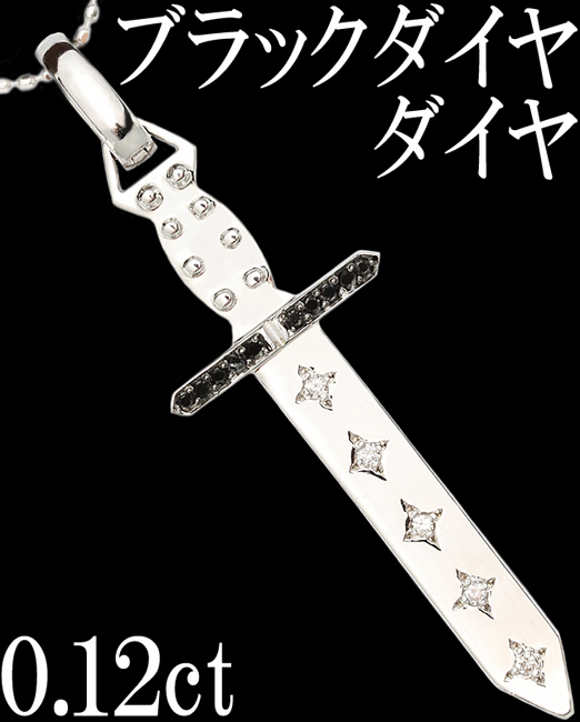 | レア☆ダイヤ ブラック 0.12ct K18WG ペンダント ネックレス タイタック ピン ブローチ 剣♪鑑別付・送料込 | ||