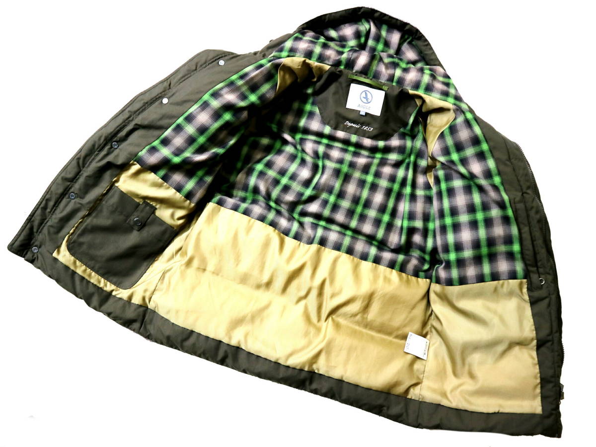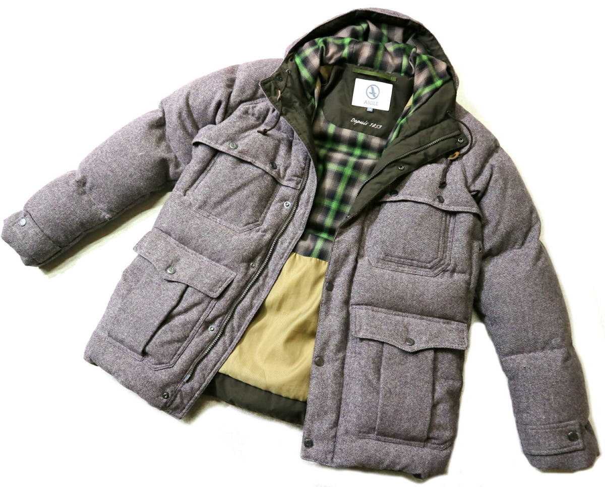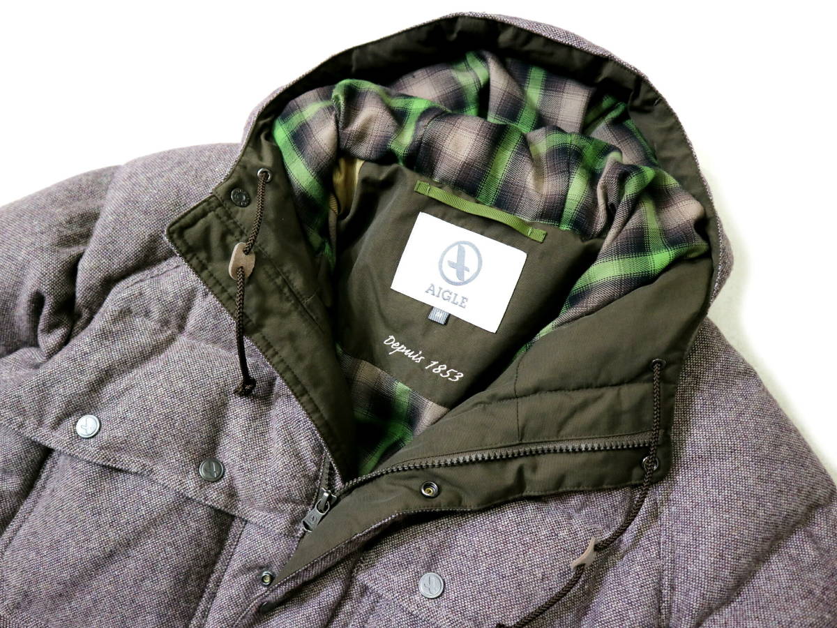 ・落ち着いた上品でお洒落なウール系生地、フード裏と見頃上部の裏地はチェック生地使用でとても雰囲気が良くお洒落です。エーグルのウール素材のダウンジャケットです。
