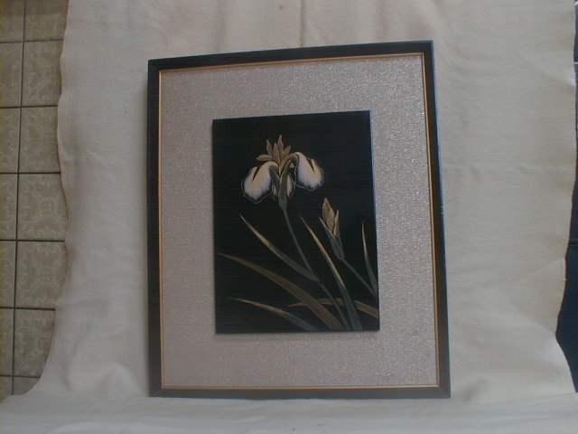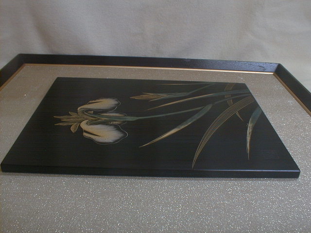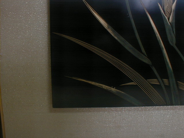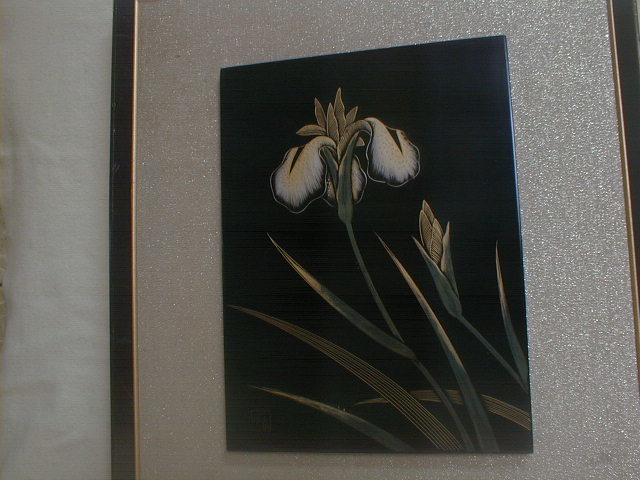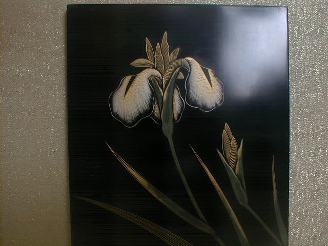 落款 垣春 アヤメ 沈金細工漆画 30x22cm 1411g 伝統壁飾り