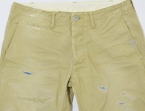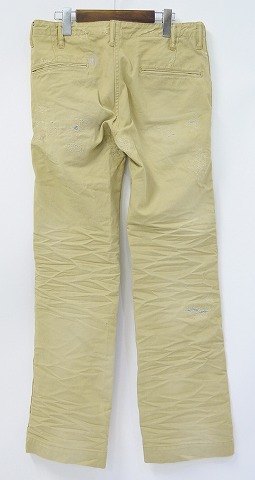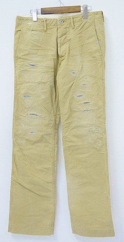 「DELAY by Win&Sons」のBilly Shoe Cut Chino。 ・素材:コットン100%。 ・カラー:ベージュ。 ・サイズ:2 (M)。 実寸・ウェスト 約78cm・股上 約23.5cm・股下 約83cm・モモ幅 約26cm・裾幅 約23.5cm。(多少の誤差はお許しください) 「物作りには人と人との繋がりが不可欠」を基に日本の確かな縫製、加工技術、持てる感性、技術の全てを盛り込み魂を込めて制作することをコンセプトにしているブランド「DELAY by Win&Sons」。「DELAY」とは反響させる音を意味し、どこまでも響き渡るサウンド(商品)を展開しています。 こちらは60年代ヴィンテージトラウザーをベースに、縦ムラの激しい硫化染めを施した70年代復刻チノ生地を使用した「Billy Shoe Cut Chino」。 スリとオイルシミや錆、リアルさを追求した洗いと番手違いのリペア、さらに5オンスのデッドストックシャンブレーを当て、ヴィンテージを追求したスペシャルリメイク加工が施されています。 タイトでキレイなシューカットシルエットもポイントです。 定価¥32000+TAX。 着用感はありますが、目立った汚れはございません。 かなりお値打ちだと思います。この機会にぜひ!。 他にもいろいろ出品しています。 管理番号:071311MY-068809 PD142404-500 ★ |