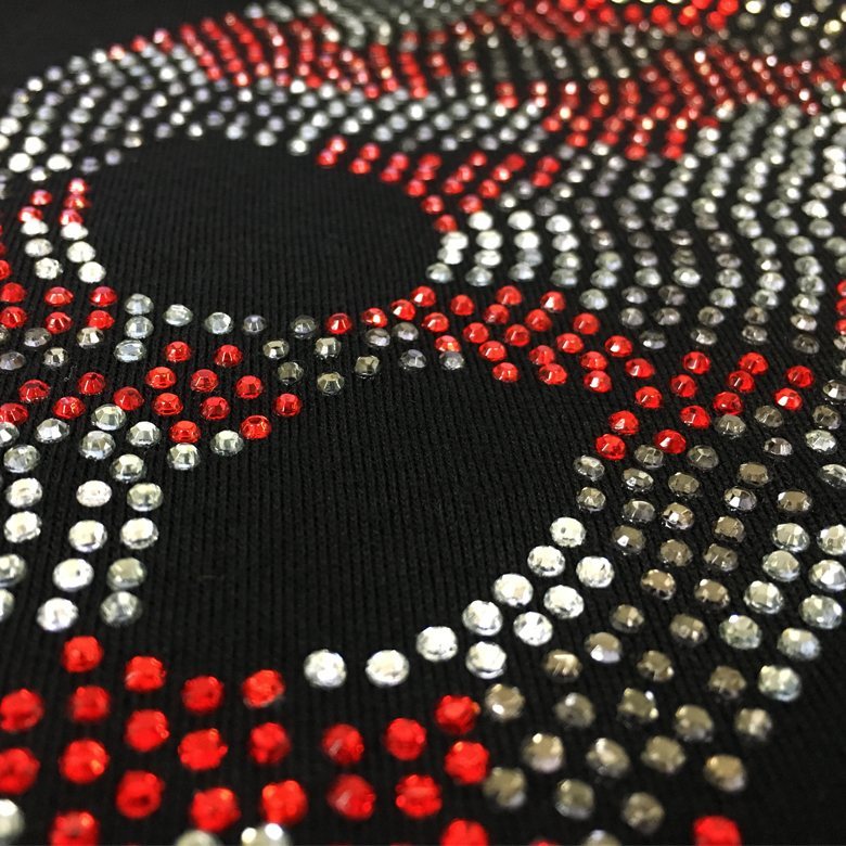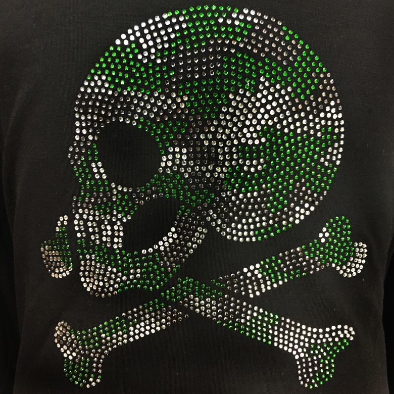 フロントにはラインストーンであしたらった煌びやかなスカルを落とし込んだインパクトのあるロンT。