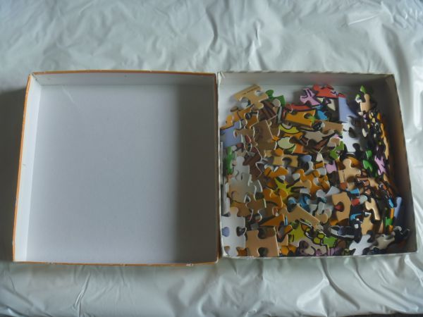 開封品です。ヘラのりスポンジ等付属しません。パズルのピース数えましたら154ピース揃っていました。外箱シールのはがし跡ツブレ等いたみあります。仕上がりサイズは37.5×26cmとあります。