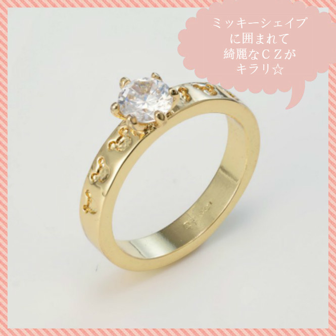 指輪入れにセットされている、金色の指輪もミッキーシェイプに囲まれた高品質のCZがキラリ。
