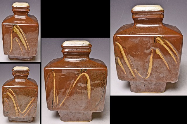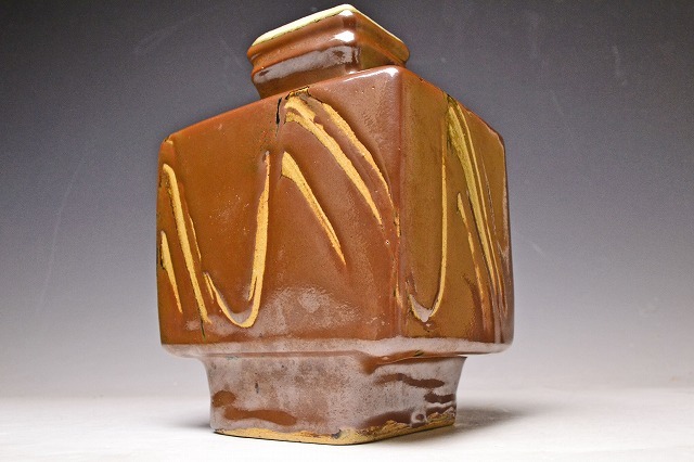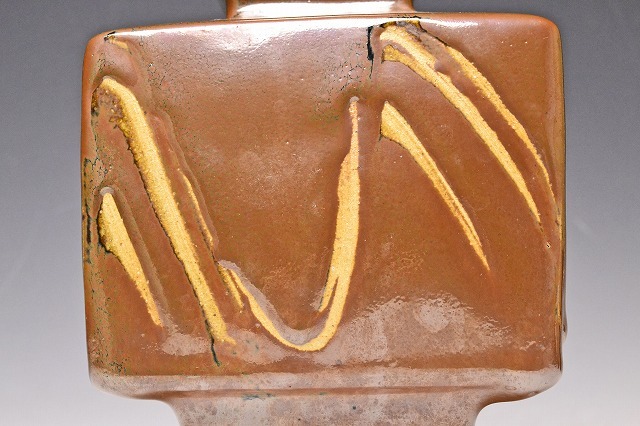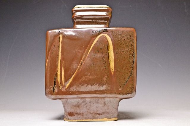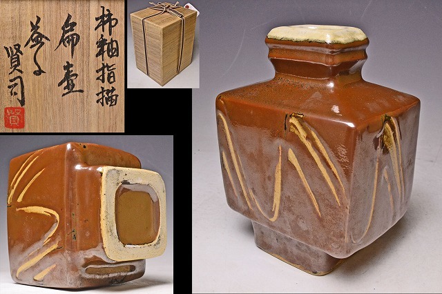 佐久間賢司 ★ 柿釉指描扁壺 ★ 共箱 ★ 益子焼 ★ 花器 ★ 花入 ★ 民芸 ★ 検 佐久間藤太郎 佐久間藤也 ★