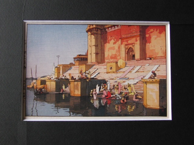 吉田博、ベナレスのガット、希少な額装用画集より、新品高級額装付、状態良好、送料無料、日本人画家