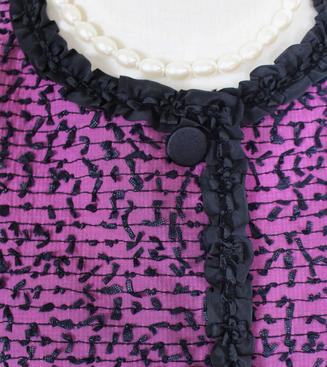 黒の小さなリボンヤーンをピラピラと縫い付けたような生地です。