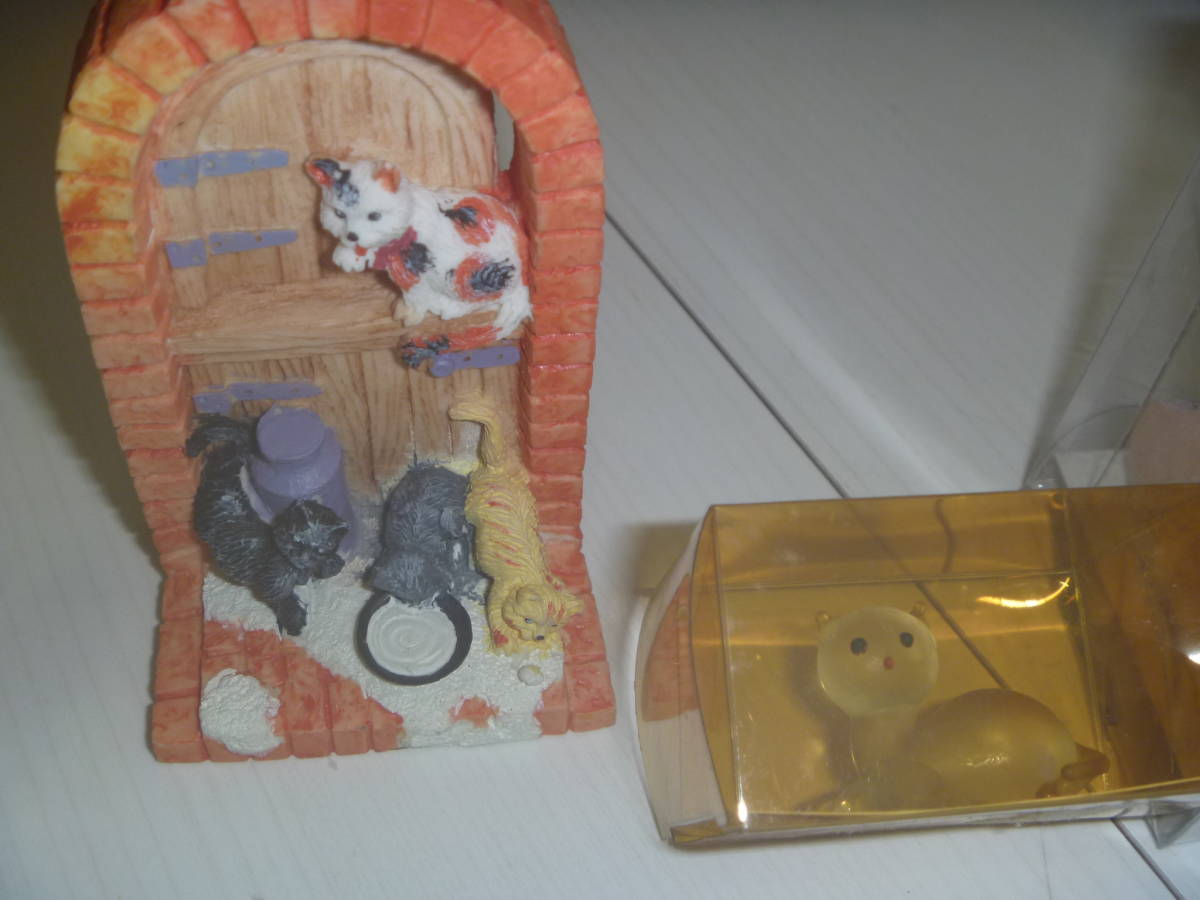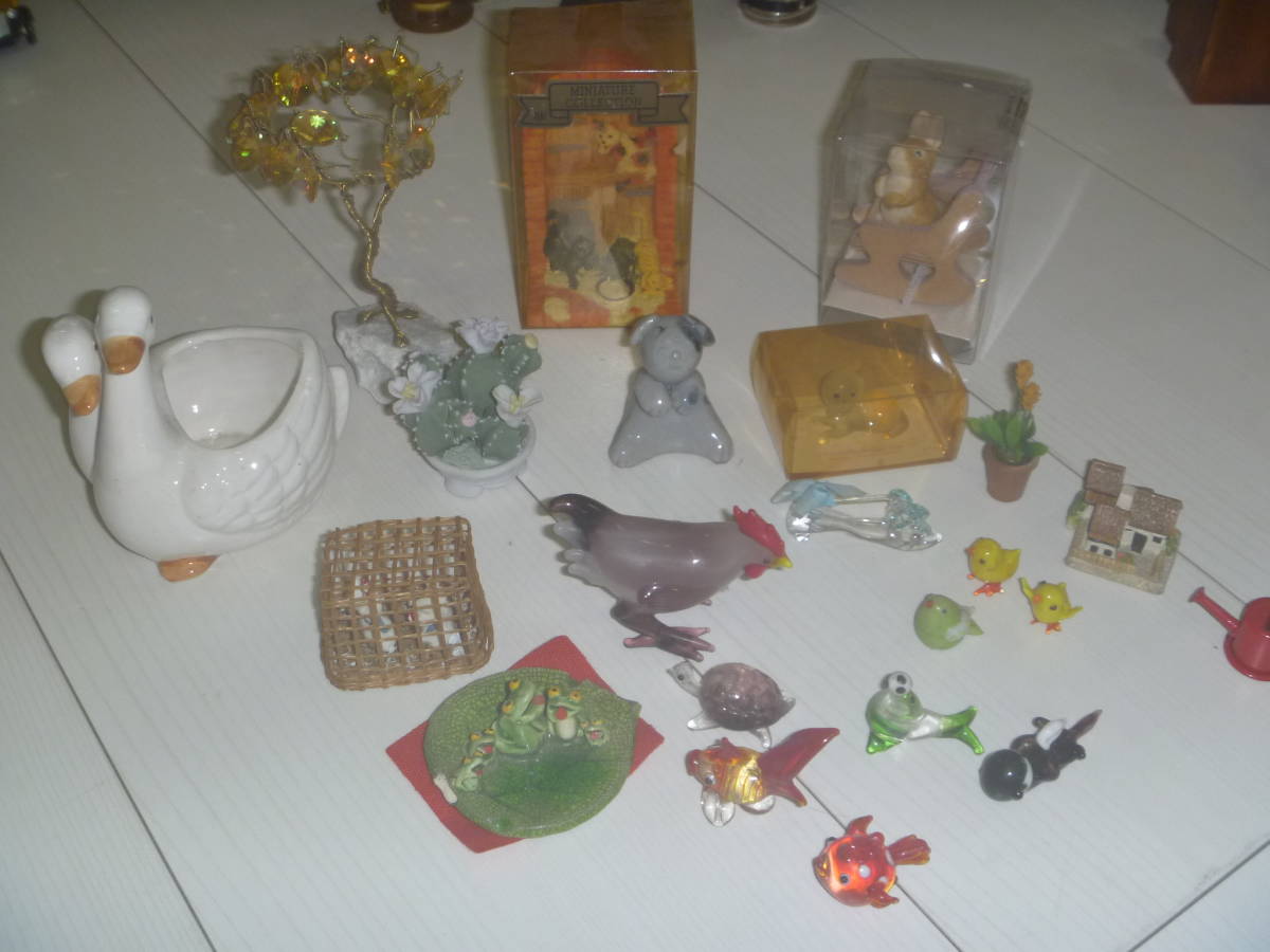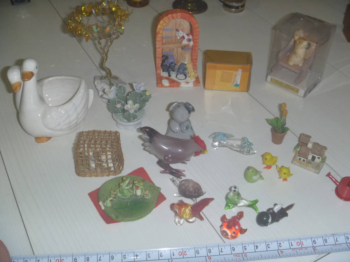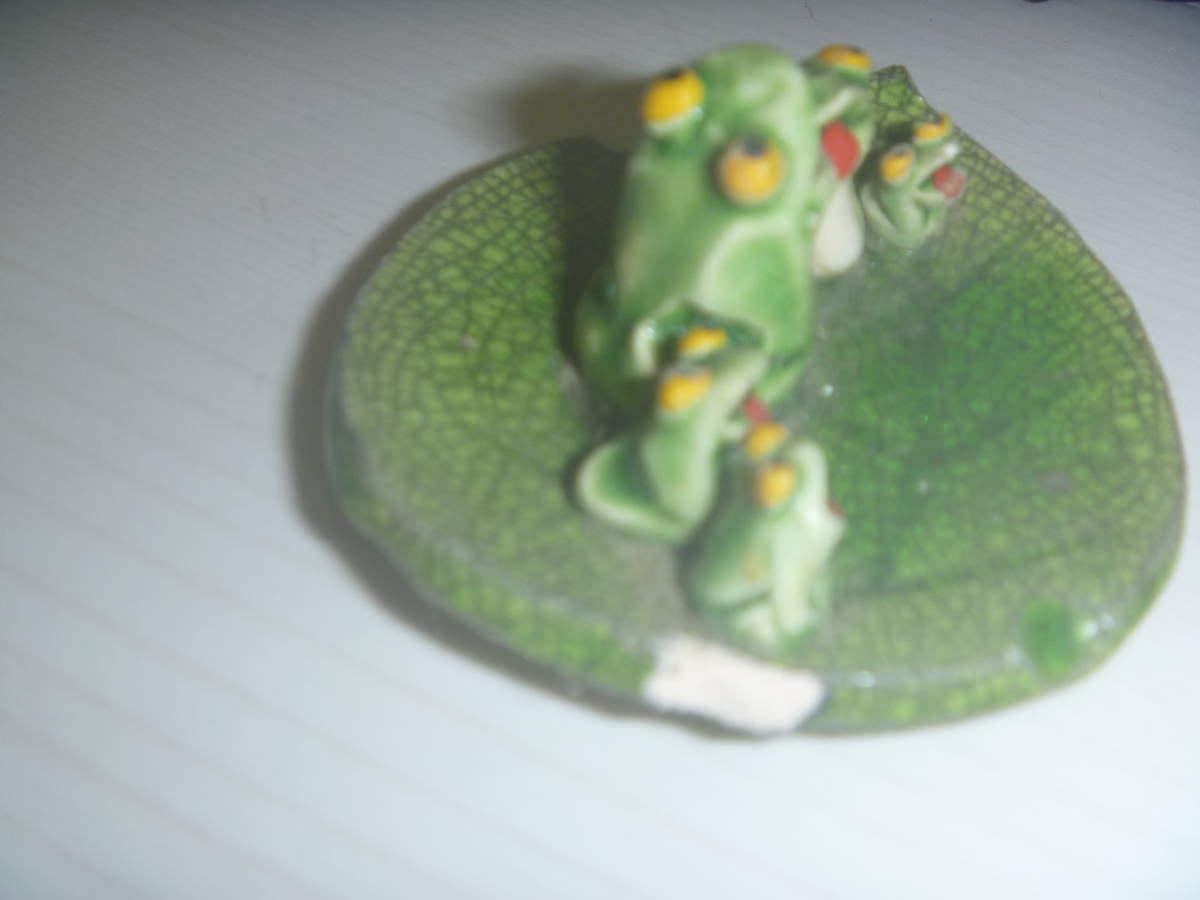 古民家から出てきたものです。写真のもの全てセットです。ガラス製の棚に飾られていたので比較的きれいと思います。写真のようにカエルの置物の葉の部分に欠けがあります。赤い敷物は含まれません。保管時の汚れ等あるかもしれません。