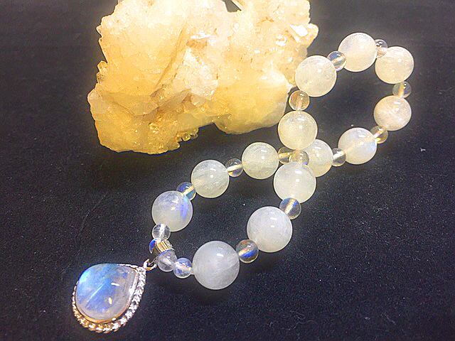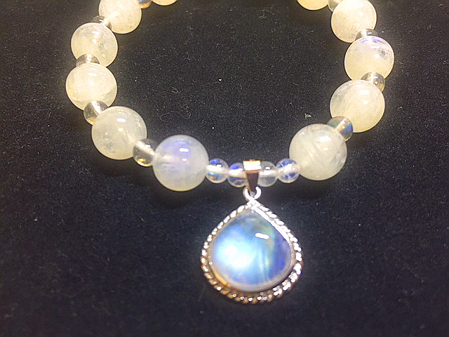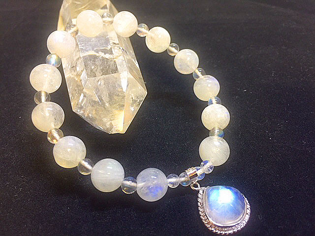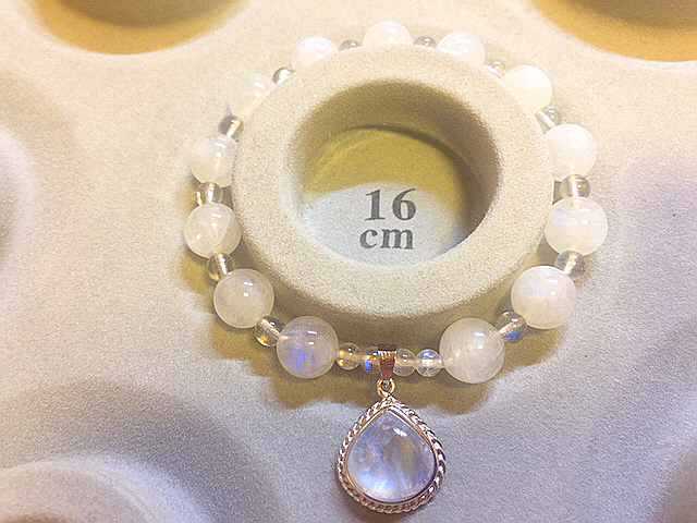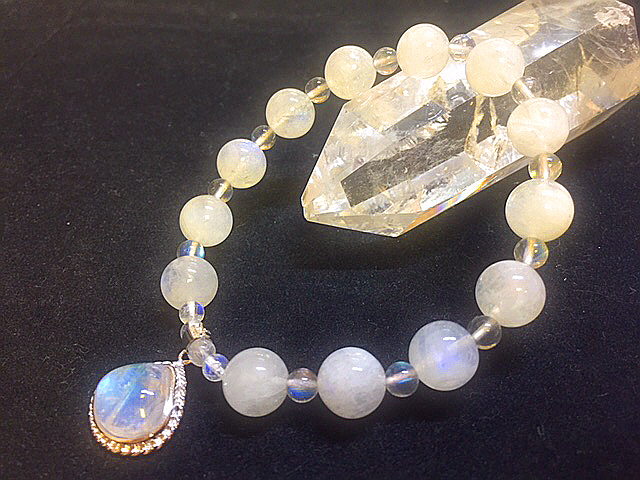 高品質なレインボームーンストーンとレインボーラブラドライトを使って作成しました、可愛いシルバームーンストーンのチャーム付きの完全オリジナルデザインブレスはいかがですか?(*^▽^*)