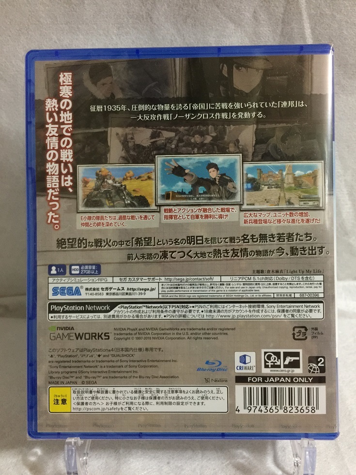 【商品の詳細や状態に関して】 ---------------------------------------------------------------------------------------------------------- ・SEGAより発売されたPS4専用ソフト"戦場のヴァルキュリア4 10th アニバーサリーメモリアルパック"の中古品(一部未使用)になります。 *仕様等、詳細はメーカーページをご参照下さい。 ・PS4専用ソフトになります。 ・追加ストーリーDLC「第7小隊との共同演習」は使用済みです。 ・ソフト及びサウンドトラックは未使用になります。 ・箱の上部の部分は開封に伴い、大き目のシワがございます。画像もあわせてご確認下さいませ。 ・中古品の為、微小の傷、シワ、くすみ、色あせ、日焼け、金属部の酸化等、いわゆる"使用感"がございますが、閲覧や機能を妨げるような大きな汚れ、破損、傷等はございません。 ・注意を払い確認いたしておりますが、素人の目視確認の為、見落とす場合がございます。ご了承下さいませ。 ・商品画像を掲示しておりますが、写真の写り具合(デジカメのフラッシュや機能性能、撮影している場所や照明器具の具合等)や閲覧時のパソコンやスマートフォン等、映像デバイスディスプレイの色の表現具合など、様々な要因によって実際の商品とは異なる色に見える場合がございます。 ・出品者含めて家庭内に喫煙者はおらず、非喫煙環境下で保存しておりました。 ・直射日光にさらさないなど一定の配慮をしておりますが、一般的な部屋に置いた程度の"素人レベルの保管状態"であり、一部未開封品もございますが、一旦人手に渡っており、またそれ以外は実際に使用していた中古品ですので、神経質な方、保存状況など完全美品を求めている方は入札をご遠慮下さいますよう宜しくお願いいたします。 |