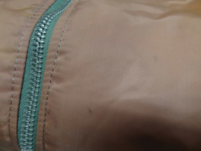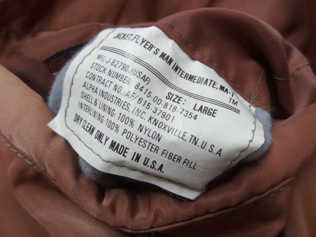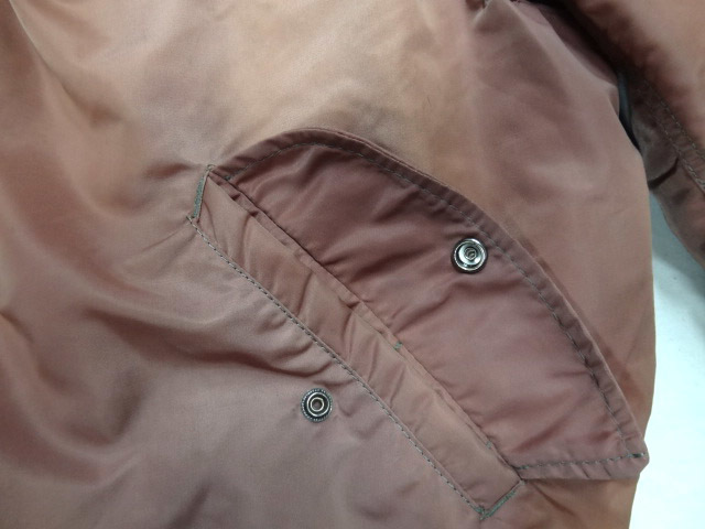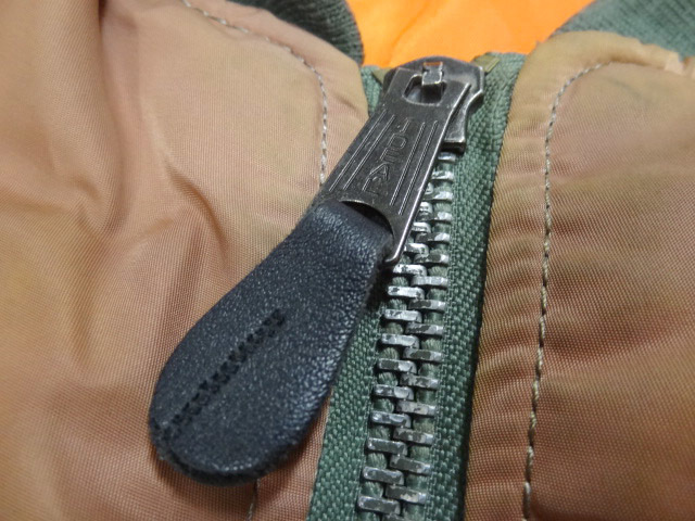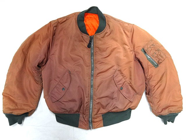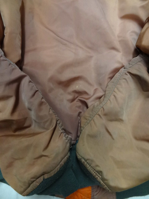 アルファのビンテージMA1です。これ以外には見たことがないレアカラーです。形容がしにくいですがレンガ色が一番近いようにも思えますが,見る人により異なる色味だと思いますので画像を参考にしてください。全体に色落ち/色焼けもしていてヴィンテージらしい雰囲気になっています。画像で色落ち具合ともともとの色味がわかるようにしてあります(画像5)。現代版のMA1は全く興味がないので無視していますが,MA1が近年流行る前から珍しいものを見つけてはコレクションしていましたが,これはトップクラスにレアな一着です。2度と見かけることはないと思います