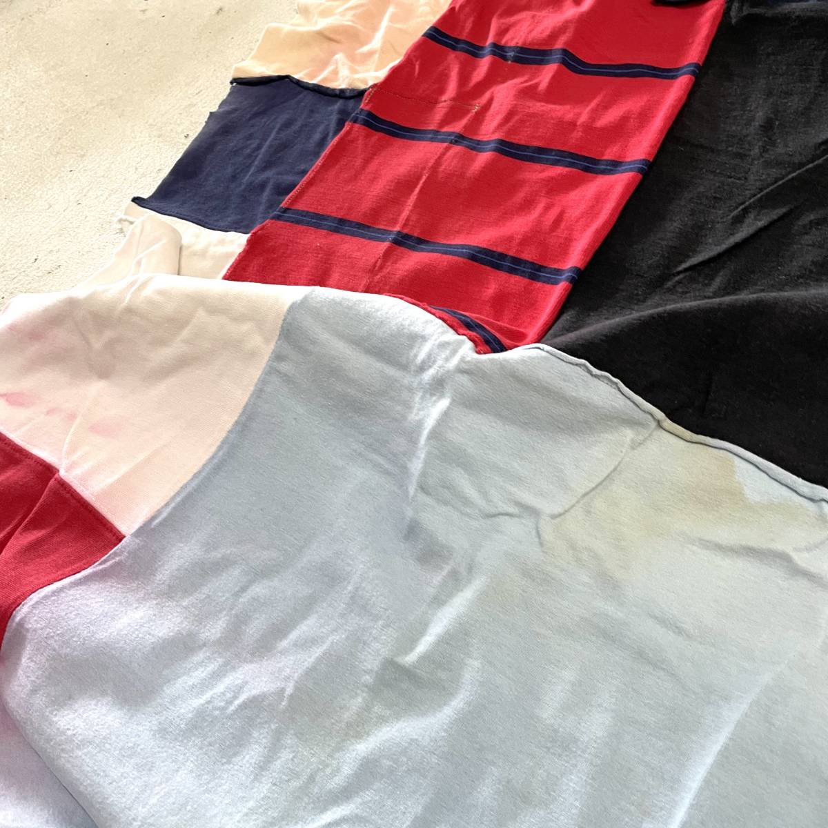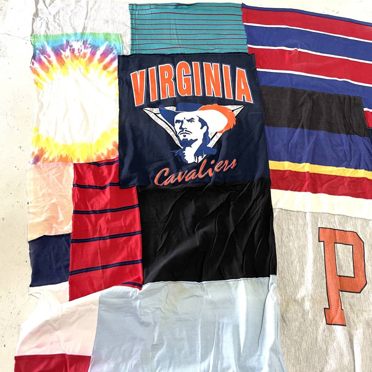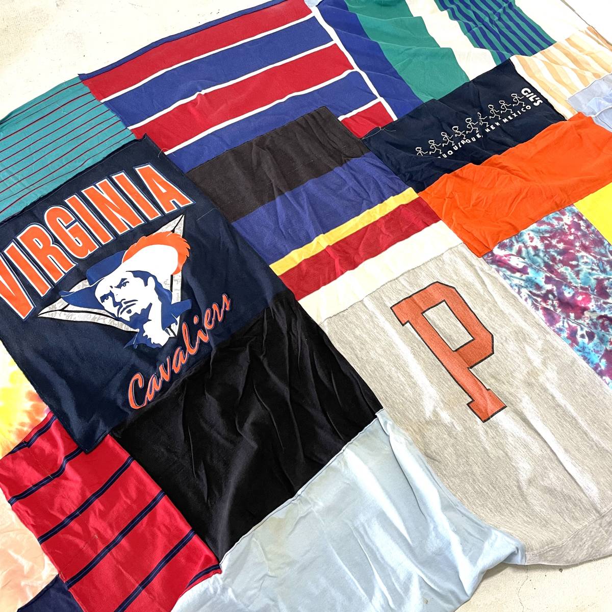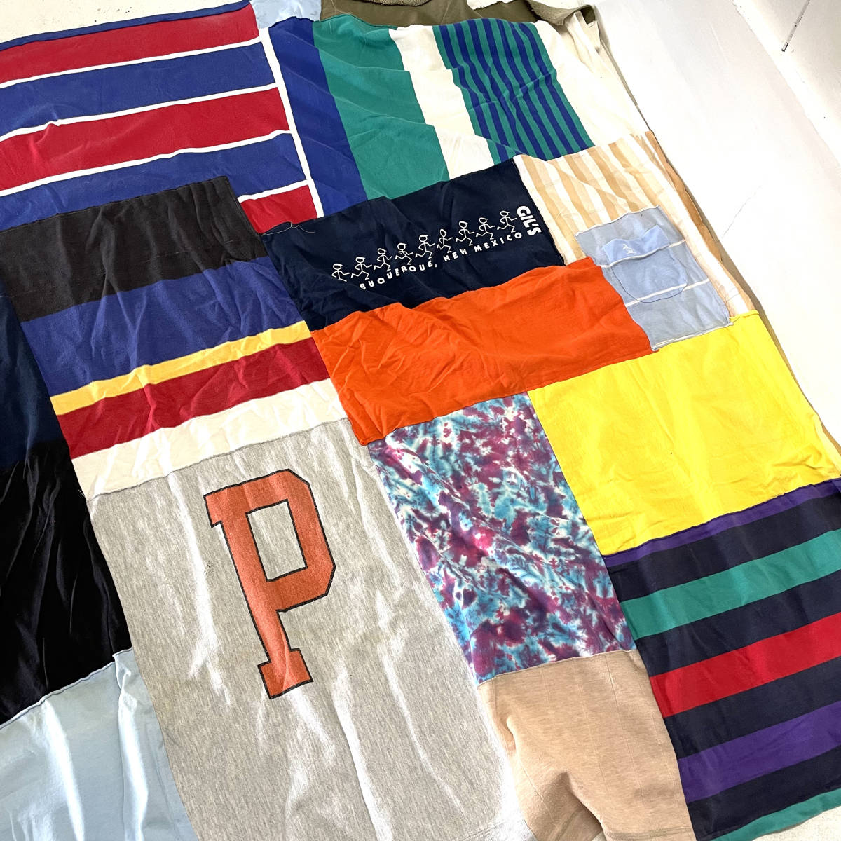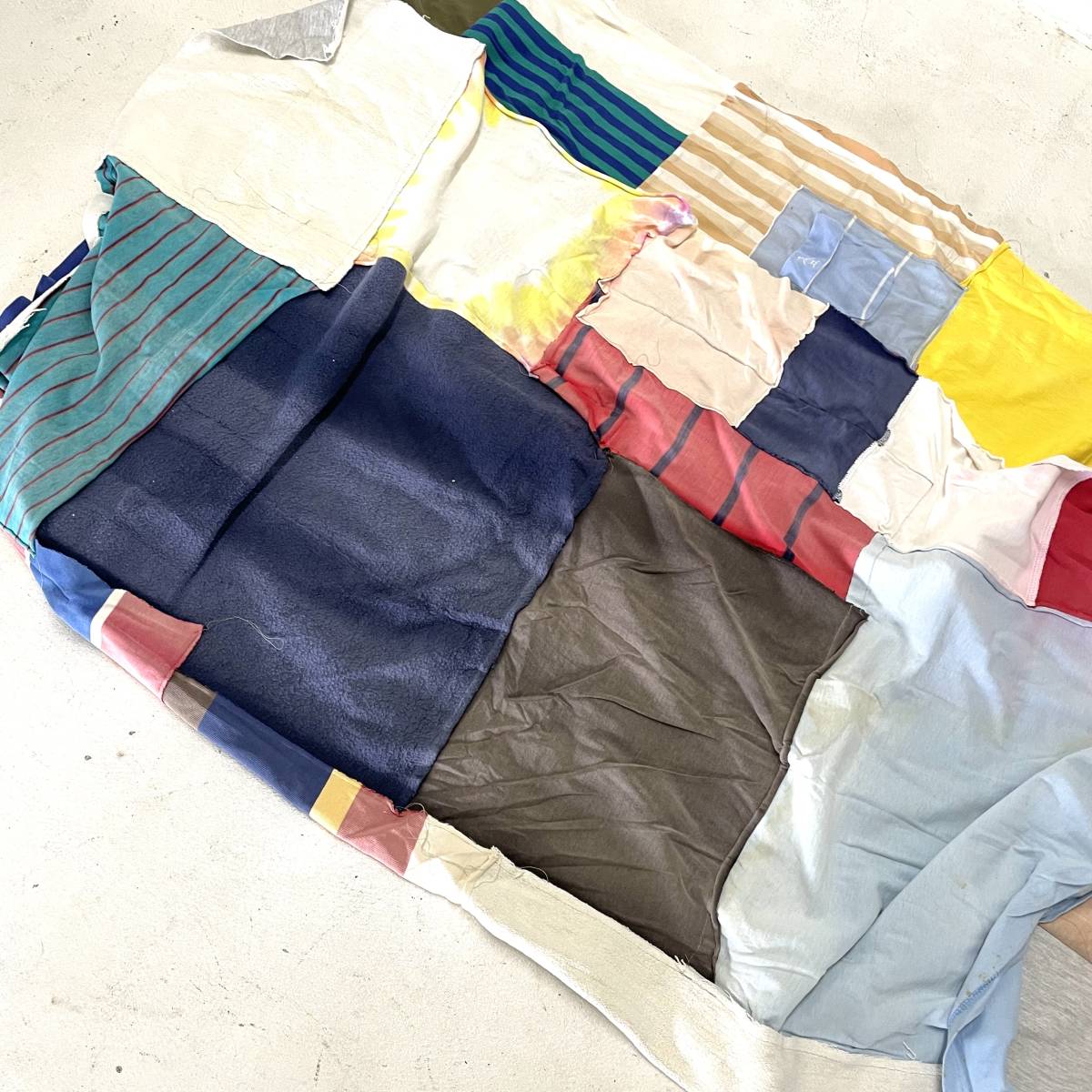 アメリカ古着をばらしてパッチワーク生地にした物になります。 スウェットや鹿の子生地、Tシャツ生地など材質は様々です。 多少のゆがみがありますので計測位置によっては表記サイズと多少の誤差があります。 アメリカ古着の雰囲気、かなり大判なのでソファーにかけたり、ベッドにかけたり、車のシートに敷いても良いですよ。 お探しの方におすすめです。 | |||