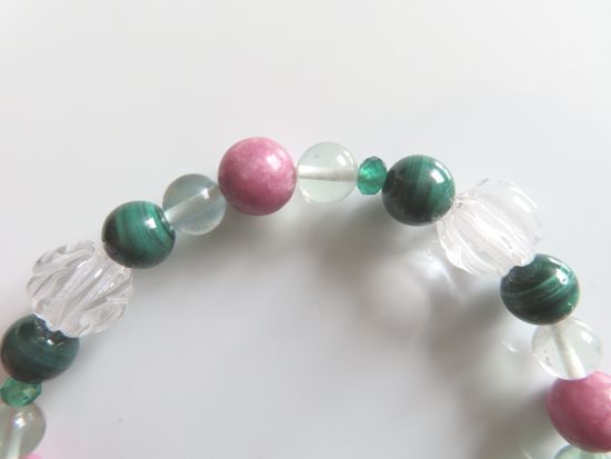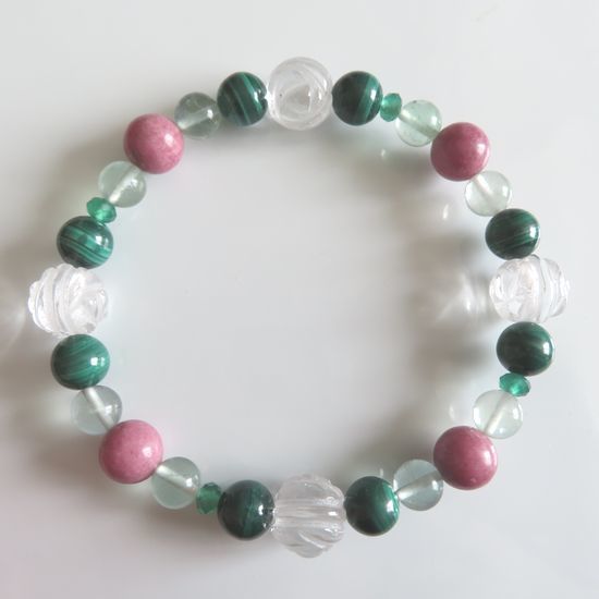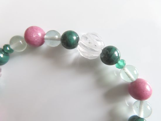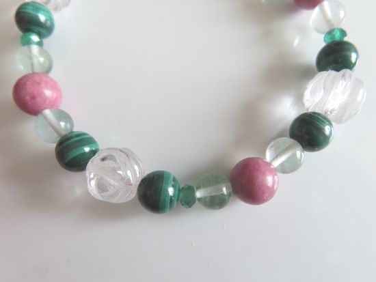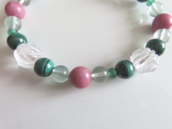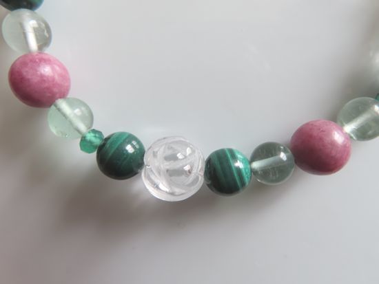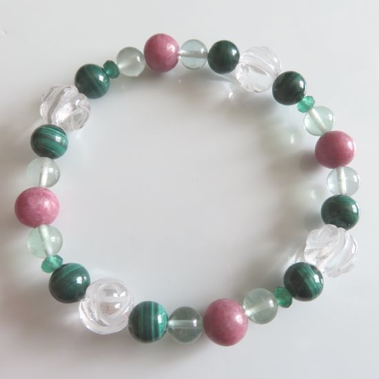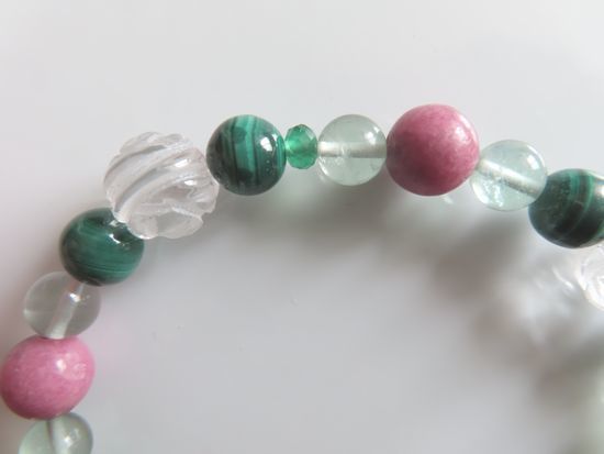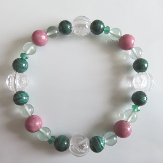 マラカイト、ロードナイト、フローライト、グリーンアゲート、水晶バラ彫りのブレスレット | |||
