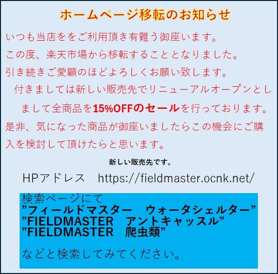 | ホームページのご案内 | いつも当店ををご利用頂き有難う御座います。 この度、楽天市場から移転することとなりました。 引き続きご愛顧のほどよろしくお願い致します。 付きましては新しい販売先でリニューアルオープンと しまして全商品を15%OFFのセールを行っております。 是非、気になった商品が御座いましたらこの機会に ご購入を検討して頂けたらと思います。 ↓ ↓ ↓ ↓ ↓ FIELD MASTER |