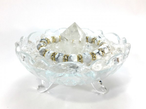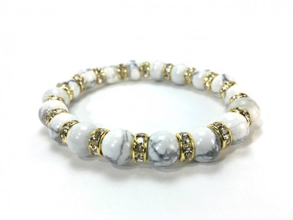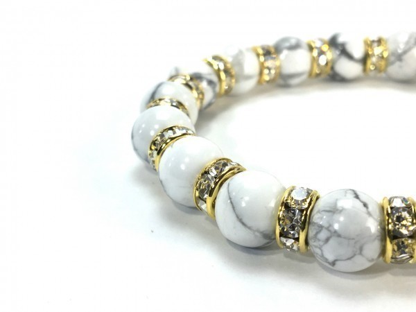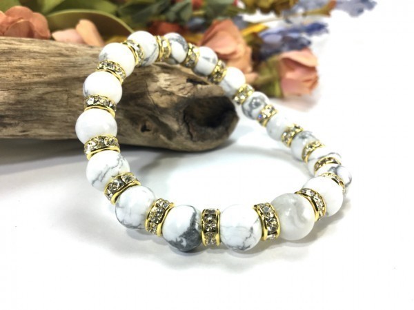 こちらは、10mm玉のハウライトを使用したパワーストーンブレスレットです。間にはロンデルを挟み高級感あるブレスレットに仕上げています。石大きさは腕にも馴染みやすいように10mm玉を使用して、サイズは内径約18cmです。(サイズ調節も無料で承っています。サイズ変更の場合は落札後、取引ナビにてご一報くださいませ。) 数に限りがございますので気になる方はお早めにどうぞ。