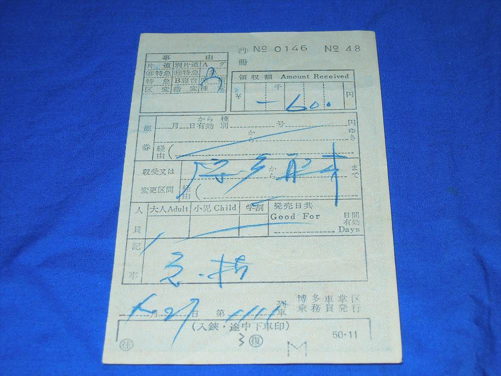 国鉄の博多車掌区乗務員発行の車内急行券座席指定券です。博多→熊本で使用されたものです。発行日は4月27日と判断できますが、発行年はS51年と推定されますものの、詳細は不明です。