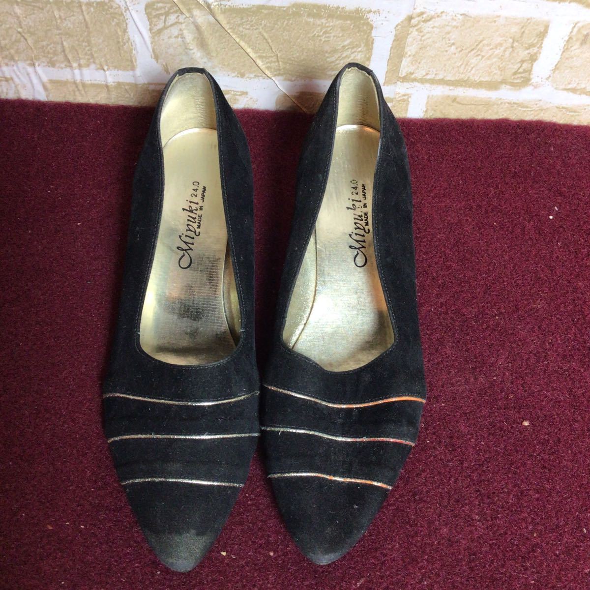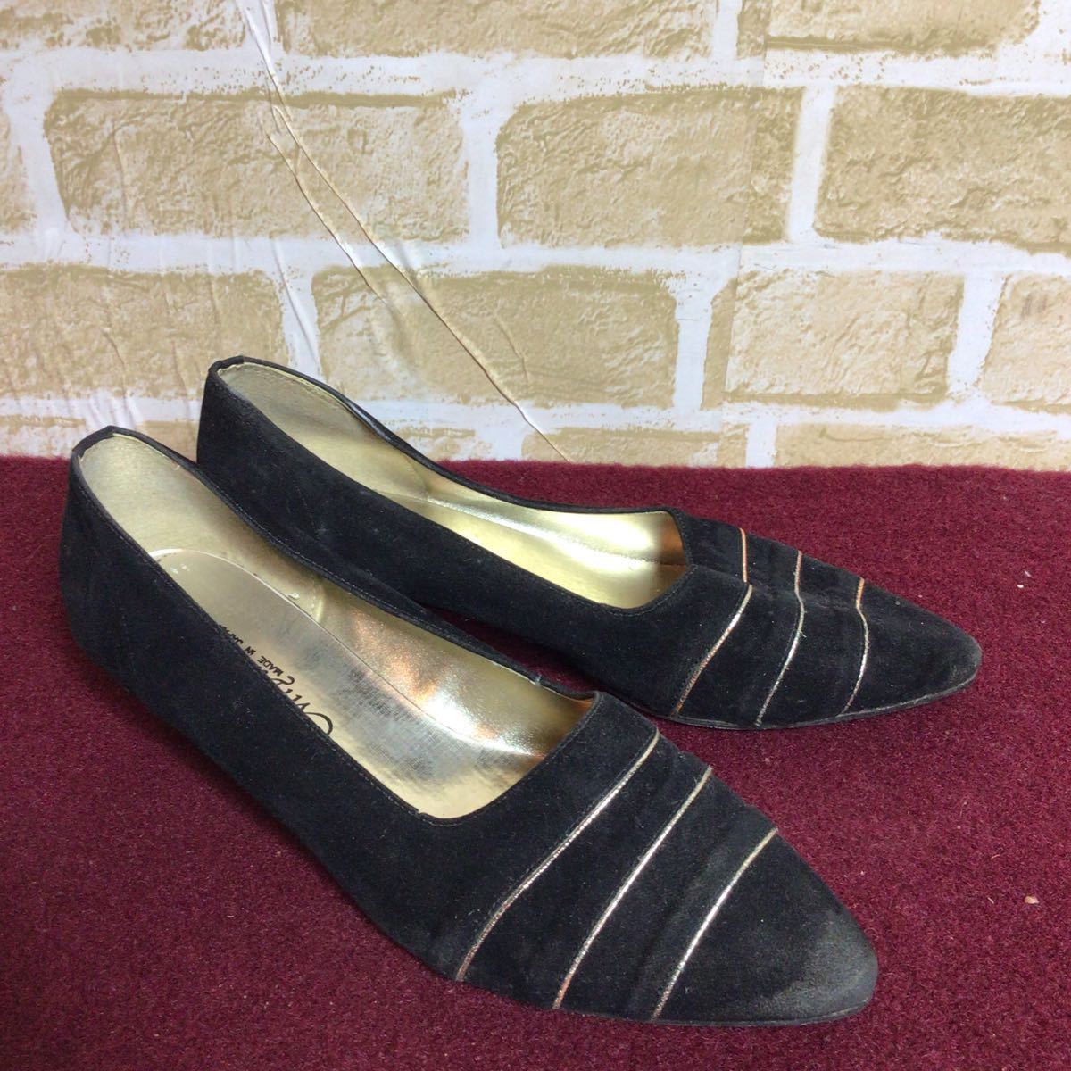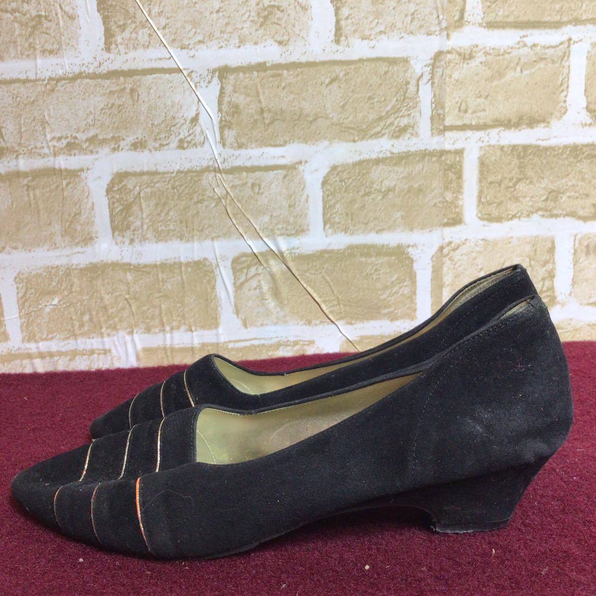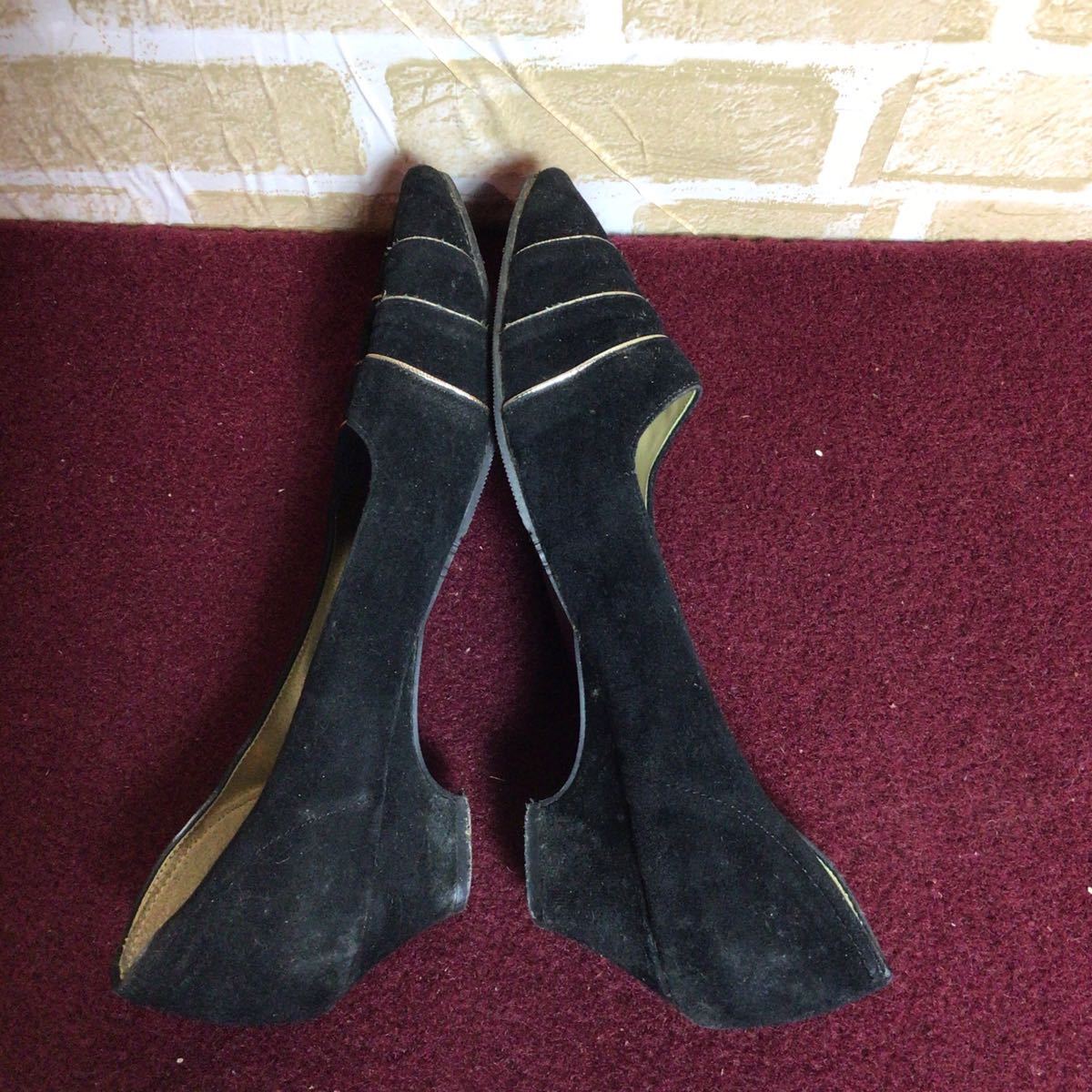【売り切り!送料無料!】A-128 スエードパンプス!24.0cmEEE!黒!ゴールドライン!可愛い!普段使い!結婚式!パーティー!ドレス!ローヒール!中古!