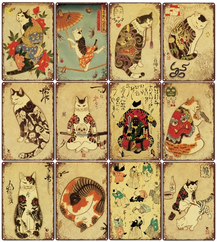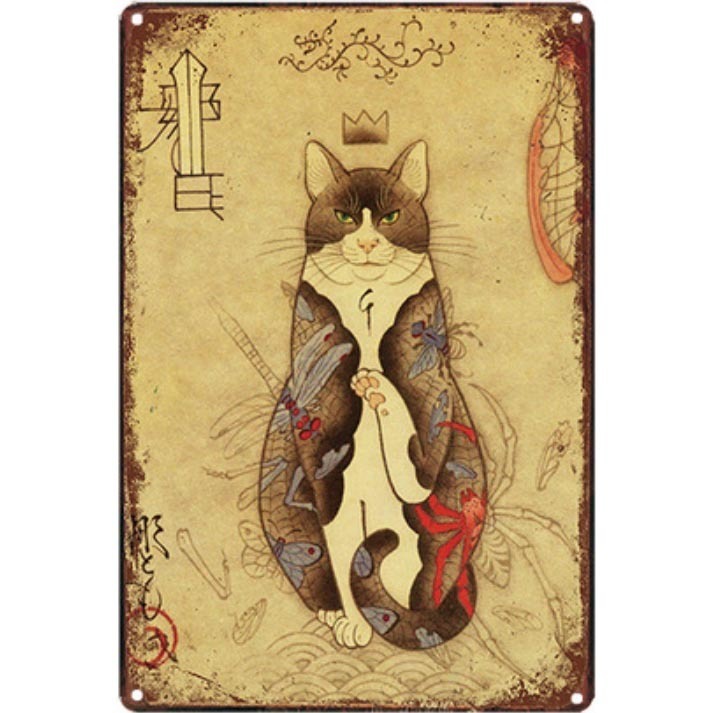 A3269 メタル サイン ブリキ 看板 金属 製 プレート サムライ 猫 侍 武士 刀 般若 鬼 浮世絵 和風 日本 タトゥー【1】