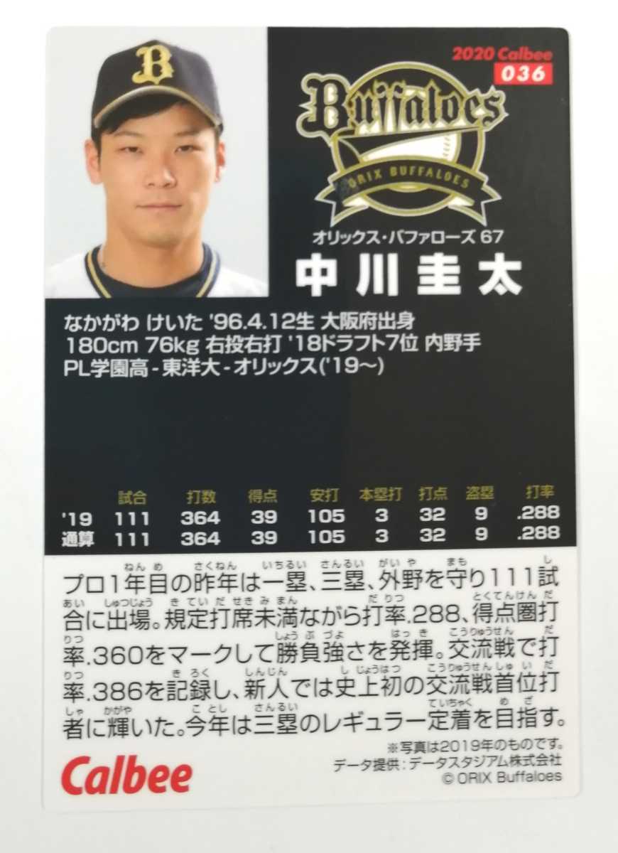 中川圭太(036)オリックス・バファローズ/2020プロ野球チップス第1弾カード【即決】