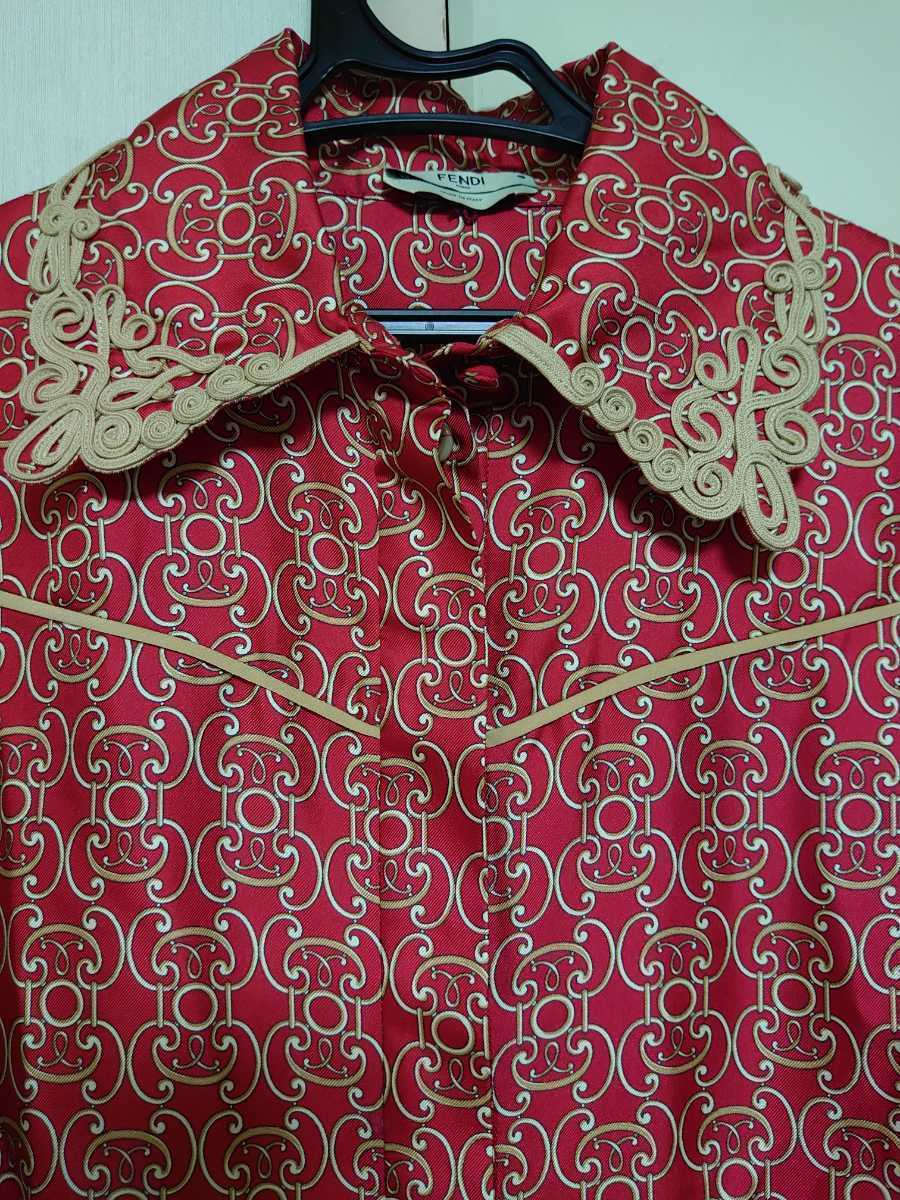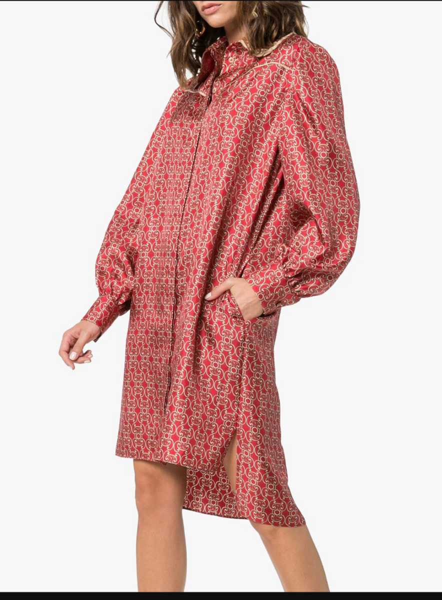 フェンディの光沢のあるシャツワンピースは、イタリア製のシルクサテンに、リラックスしたシルエット。