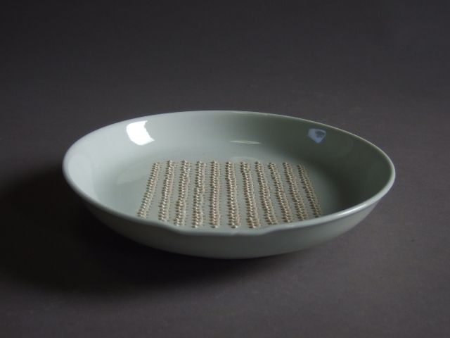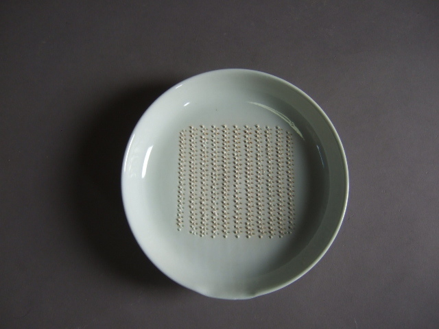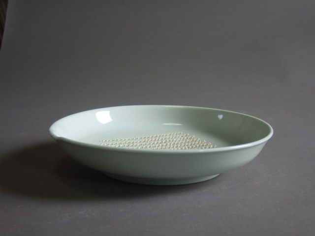 直径21.7-21.6cm、高さ4.1cm。画像の通り白磁の美しい大型おろし器です!伊万里ではないかと思いますがあるいは平佐の可能性もあるかと思います。整然とおろしの歯が施され、高さは低く、わずかに片口に作られています。大きな傷気もなく実用に、またオブジェとしてみても楽しい逸品です。この大きさは珍しく全体のバランスも見事なもので、シンプルながら美しい日本のデザインです。