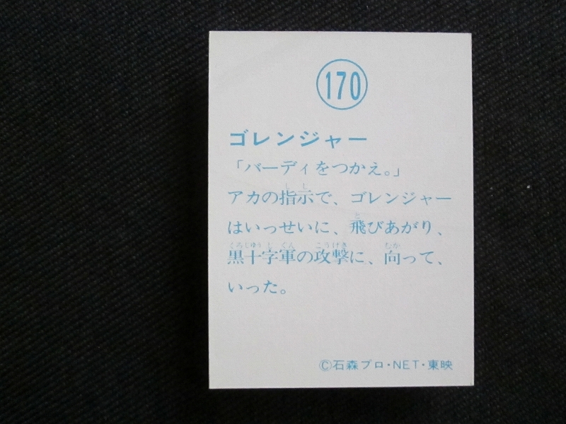 秘密戦隊ゴレンジャー ミニカード 70年代 バラ売り ・メーカー:山勝 ・1975年頃、当時の放送時に販売 ・6.6 cm x 5.0 cm ・同梱発送可能(複数落札の場合:定形、定形外郵便は、送料が変わる場合があります。) ・1-288番シリーズ ・1弾80種 001-080(タイトル違い.55.57.59.61.71.76.77,表修正.73) ・2弾32種 081-112 ・3弾64種 113-176 ・4弾48種 177-224 ・5弾32種 225-256 ・6弾32種 257-288 〓参考項目〓 ・原作石森章太郎 ・脚本上原正三 他 ・監督竹本弘一 他 ・制作テレビ朝日 ・放送期間1975年4月- 1977年3月 ・全84話 〓出演〓 ・海城剛・アカレンジャー:誠直也 ・新命明・アオレンジャー:宮内洋 ・大岩大太・キレンジャー:畠山麦 ・熊野大五郎・2代目キレンジャー:だるま二郎 ・ペギー松山・モモレンジャー:小牧りさ ・明日香健二・ミドレンジャー:伊藤幸雄 ・江戸川総司令:高原駿雄 ・陽子・007:鹿沼えり ・黒十字軍総統:安藤三男、八名信夫 ・ナレーション:田中信夫、大平透