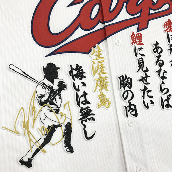 商品説明 | 広島 カープ 野間峻祥選手のサイン付きシルエット、アイロン接着用刺繍ワッペンの出品です。 アイロンにて簡単に接着可能♪♪ ※写真のユニフォーム、応援歌ワッペン等、他の装飾品はついておりません。 |