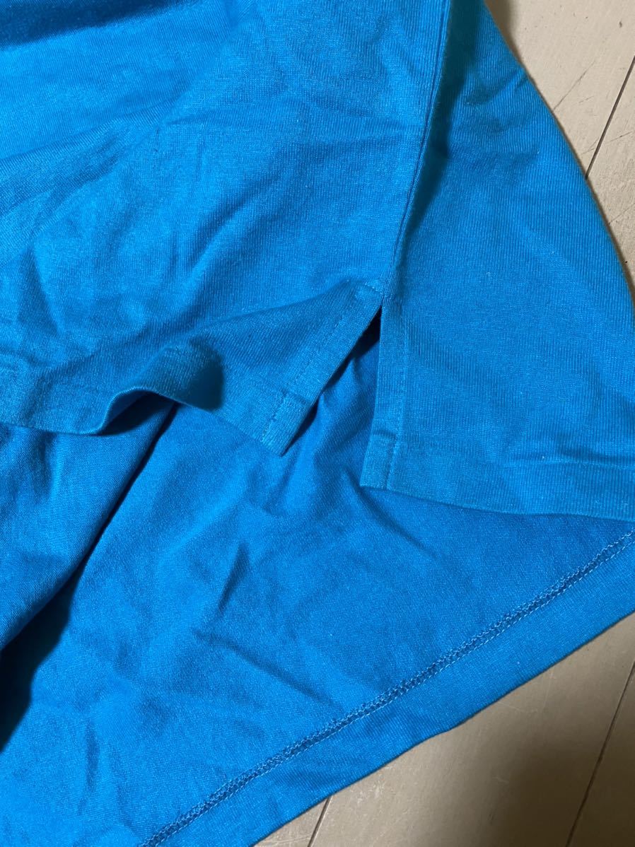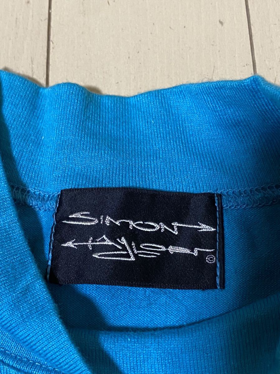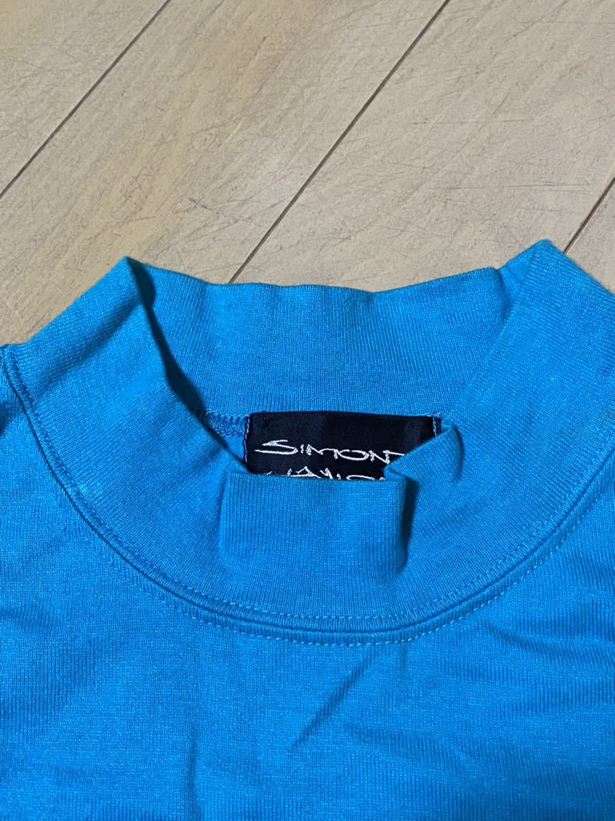 Simon TaylorのTシャツです。Simon Taylorはアート集団TOMATOのメンバーでWORK NOT WORKのデザイナーです。TOMATOはUNDERCOVERとコラボもしていた筈です。90年代後半にロンドンで購入しましたがSimon Taylor名義のアイテムは日本では未発売だったと思います。モックネックで裾のサイドにはポロシャツのようなスリットが入っています。カラーはターコイズです。サイズ表記がありませんが実寸は肩幅52cm,袖丈23cm,身幅54cm,着丈74cmです。試着のみの新品ですが首元にやや汚れが有ります。ノークレーム、ノーリターンで宜しくお願い致します。