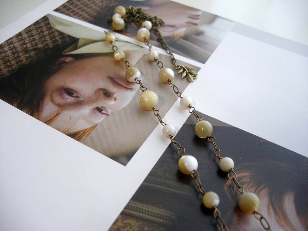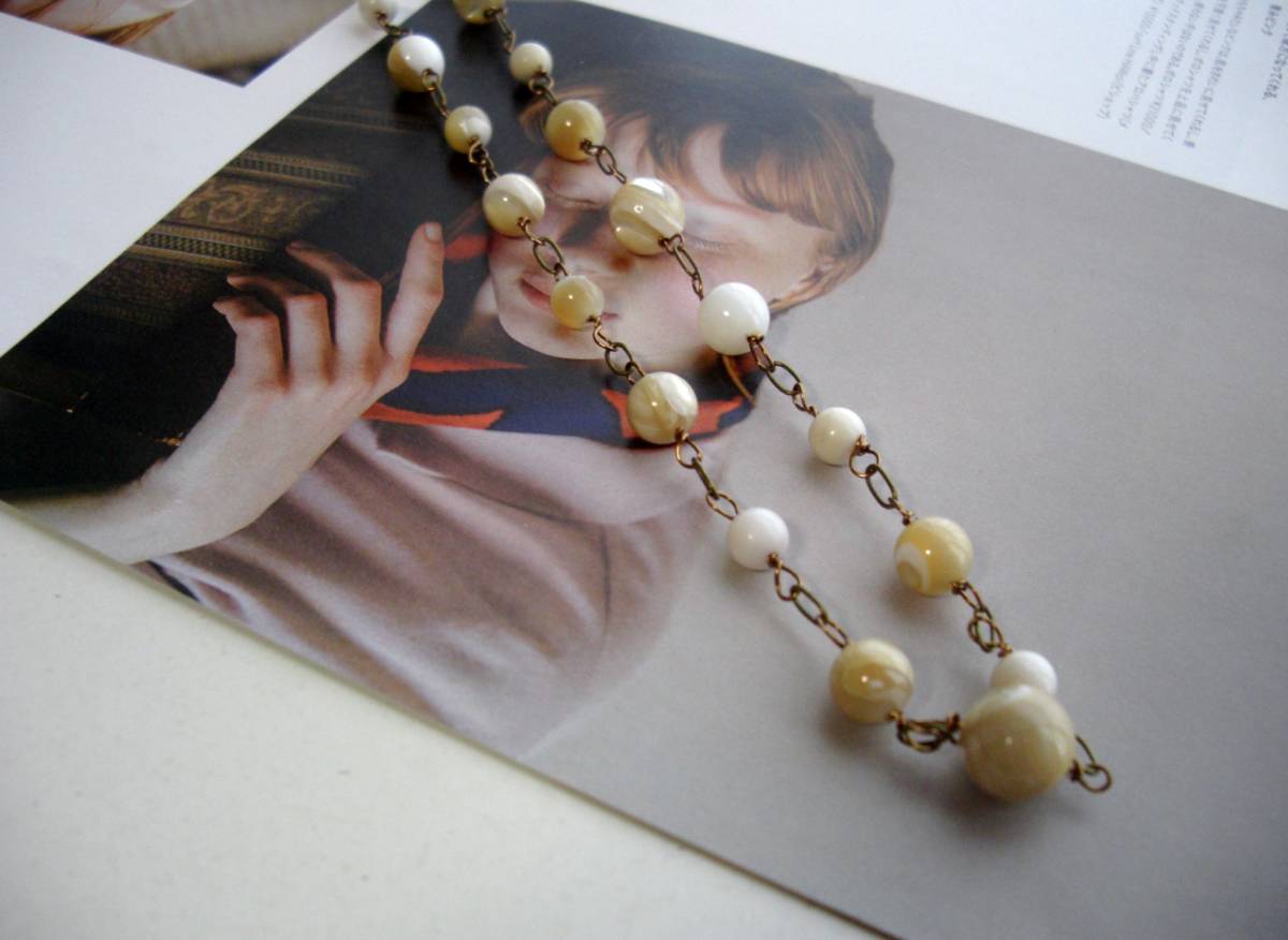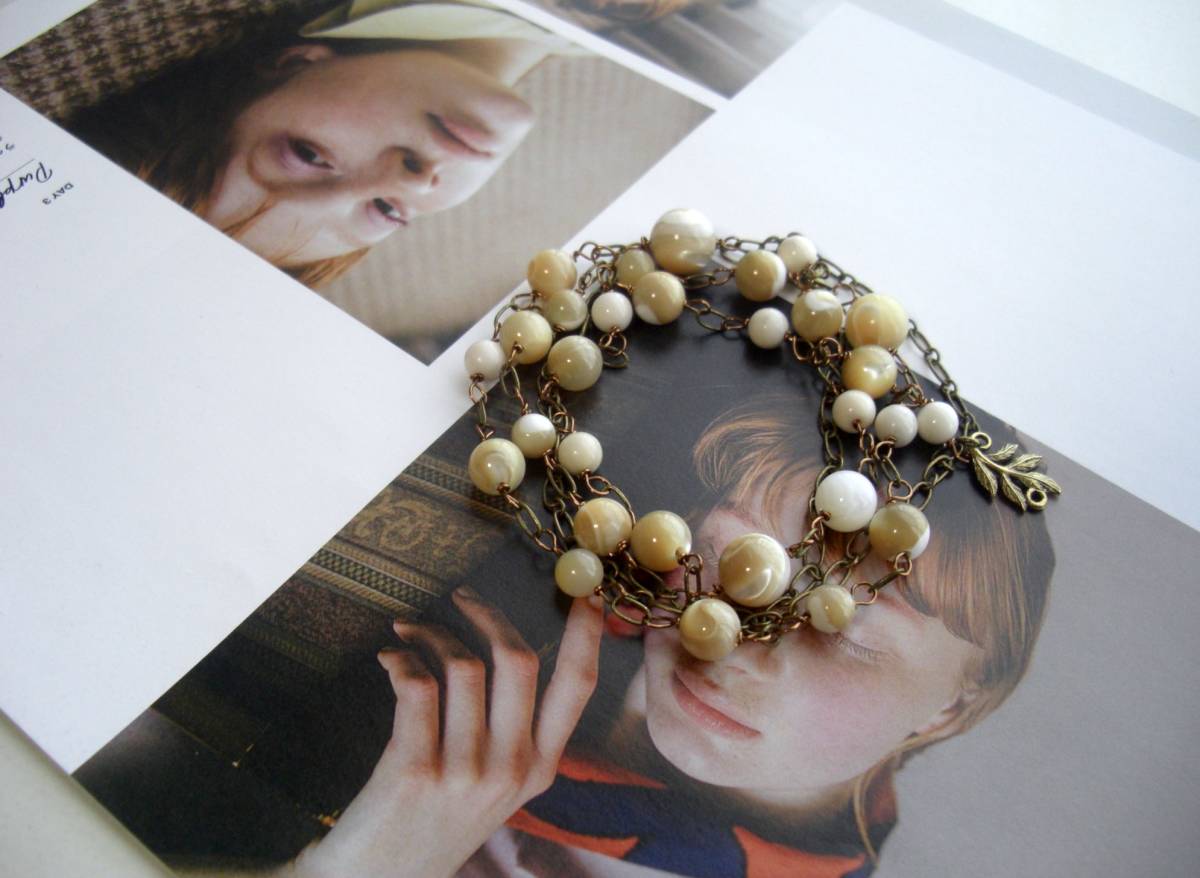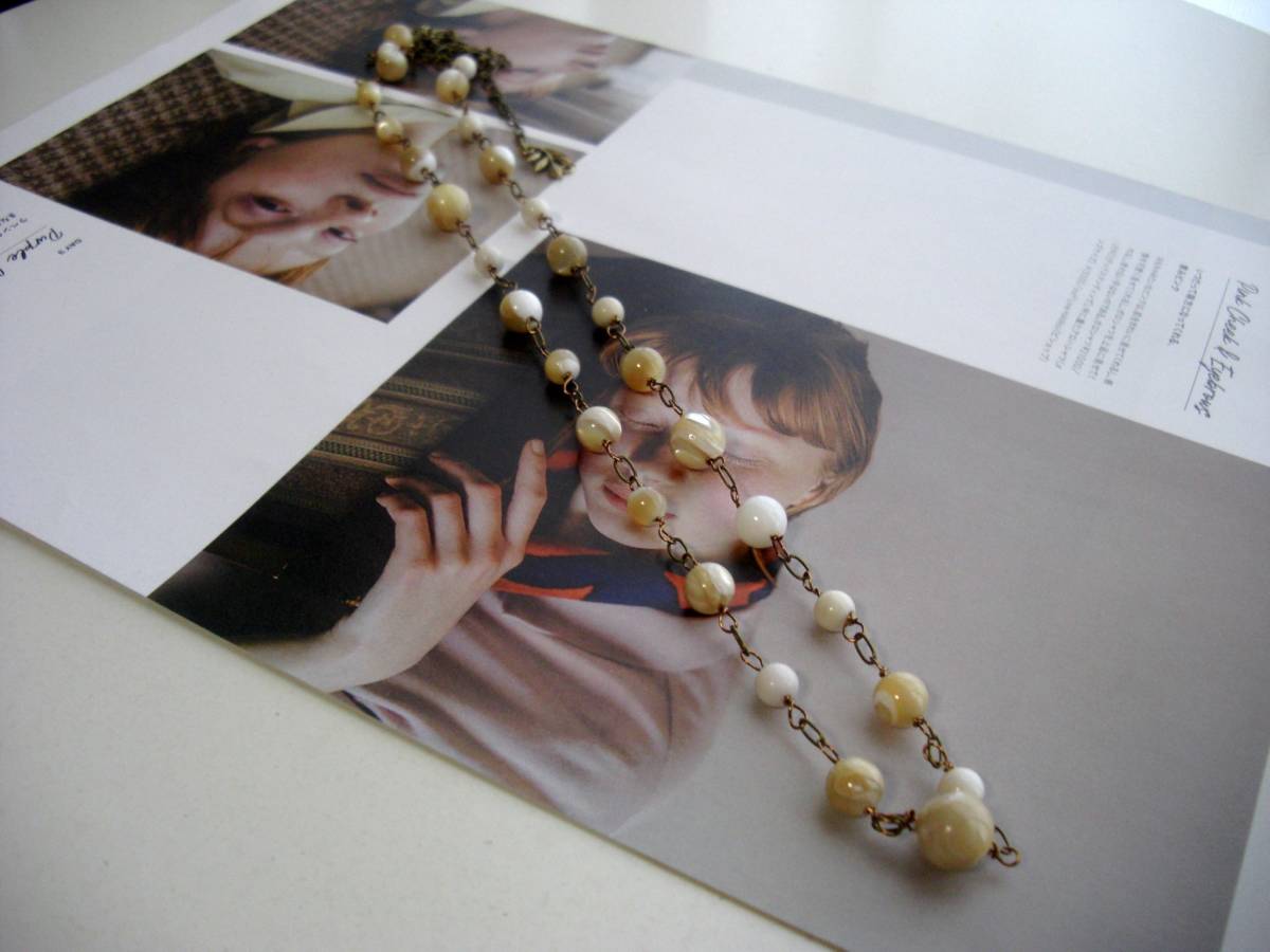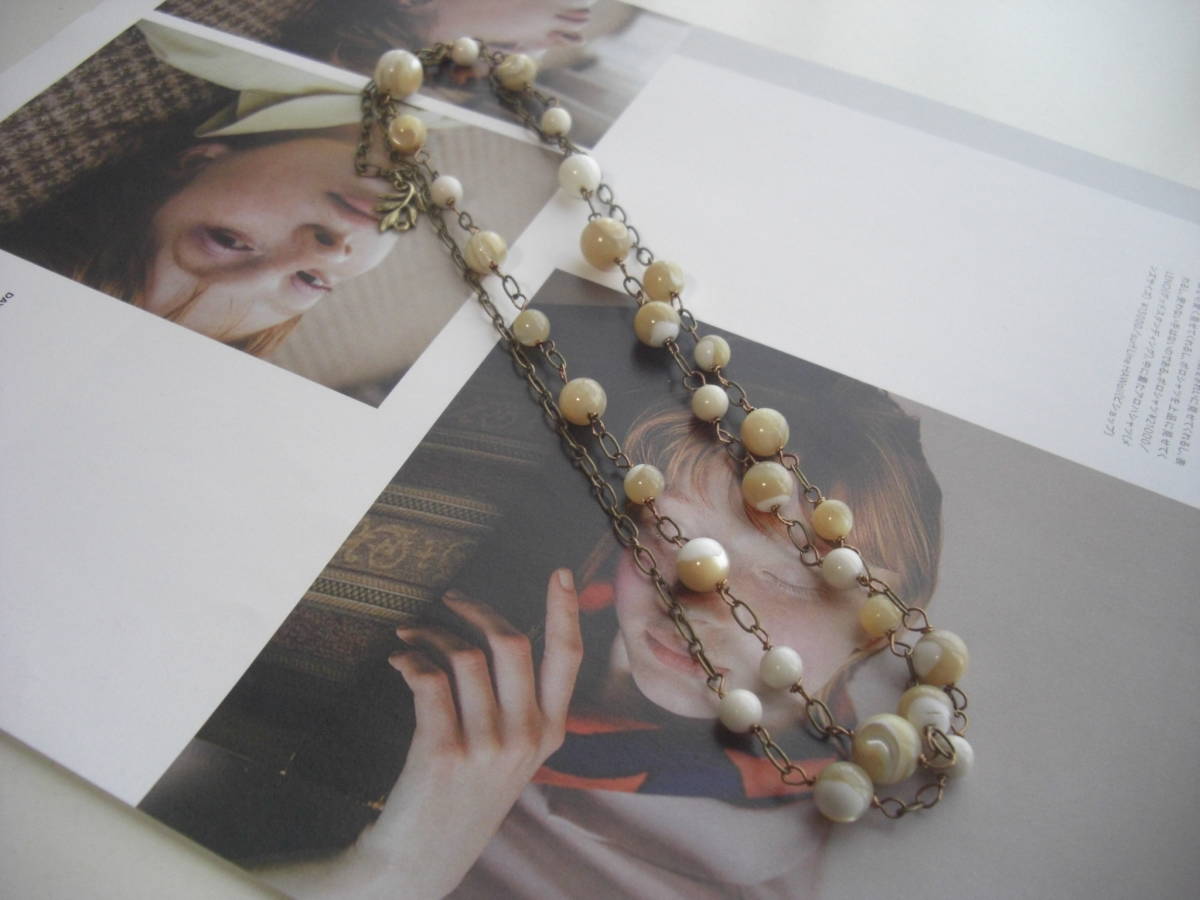 大人色のパンク・・シリーズです♪シックなマザーオブパールのネックレスです♪合わせやすいベージュ色のマザーオブパールを繋いで甘すぎないロマンチックな表情です♪6ミリから10ミリ位までの丸玉のネックレス は長さは全長90センチ位で調節自由です♪長いので2連にされたり画像のようにブレスにされても素敵です♪お揃いの シリーズも出品しています♪♪ハンドメイドをご理解いただいてノークレーム・ ノーリターンでお願いします♪