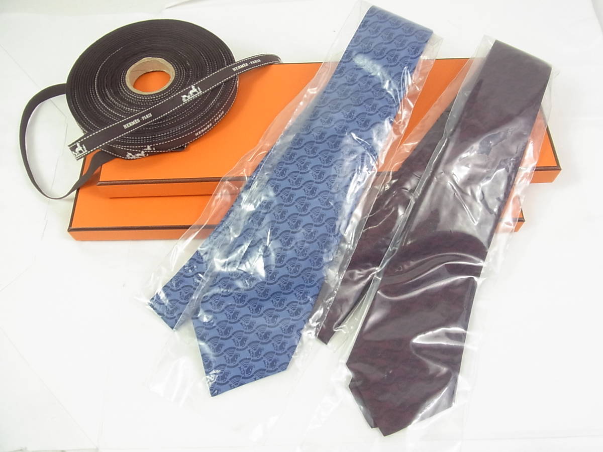 ■■エルメス★エールフランスコラボ新品シルクネクタイ2本セット(ブルー&ワイン) お箱付き 贈答用にも■■20