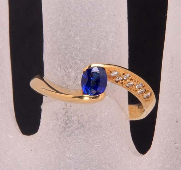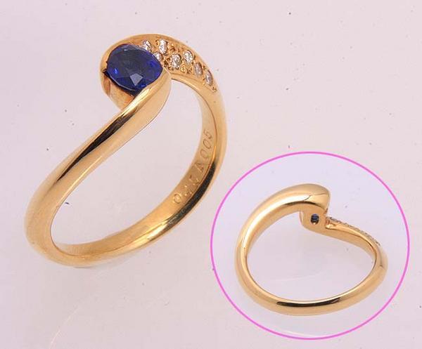 オーバルカットサファイアとメレダイアが輝くデザインリングです。