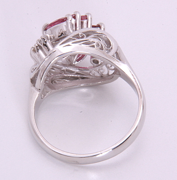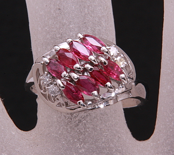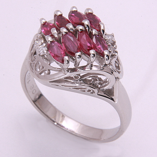 マーキスカットのルビーが8石で合計1.02ct留められたデザインリングです。