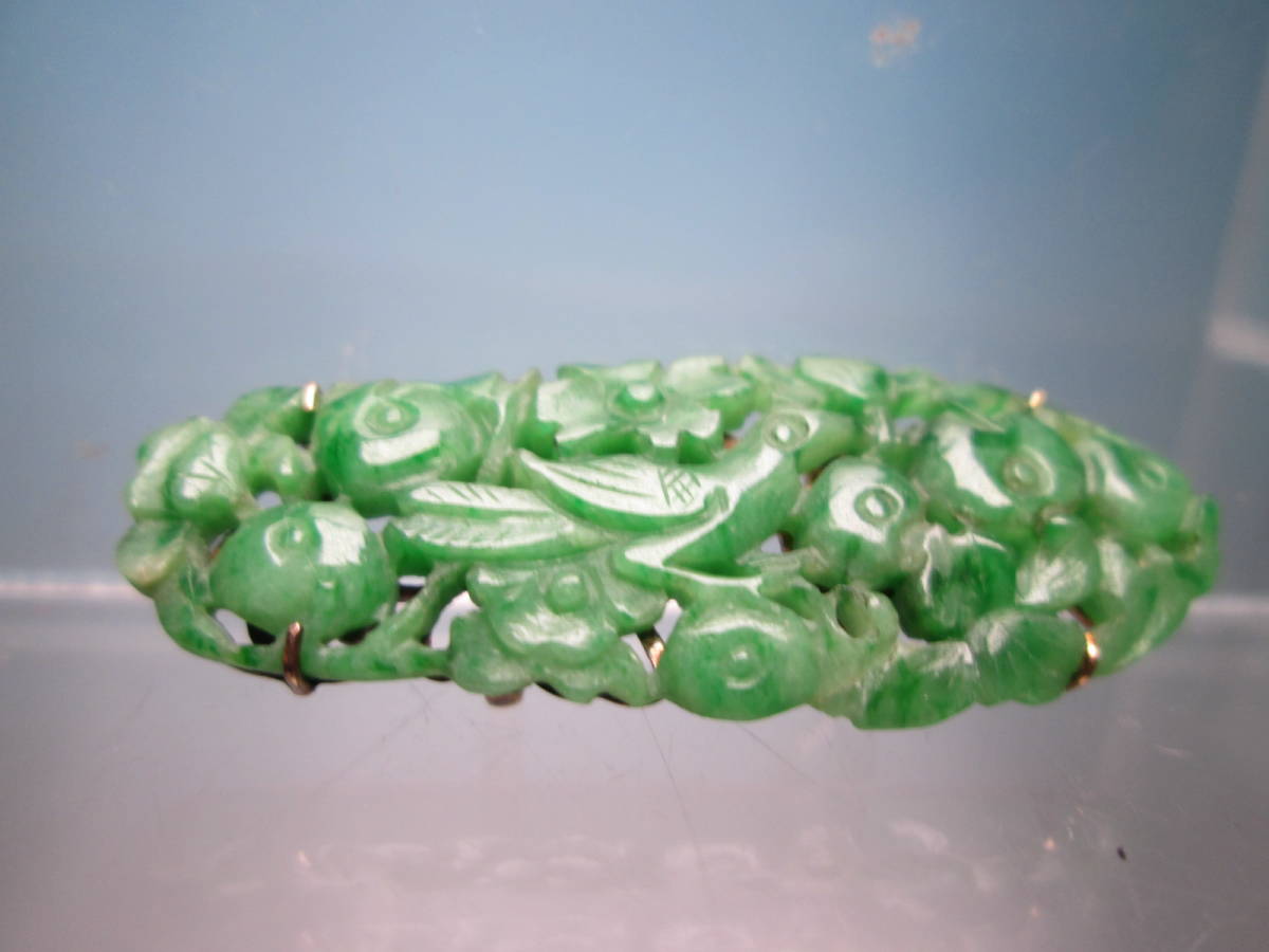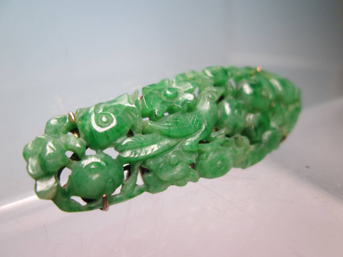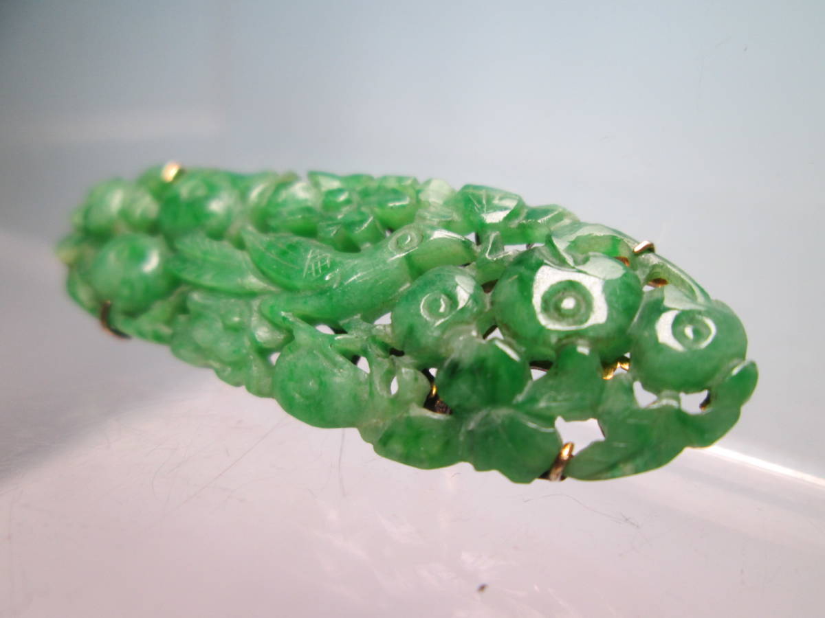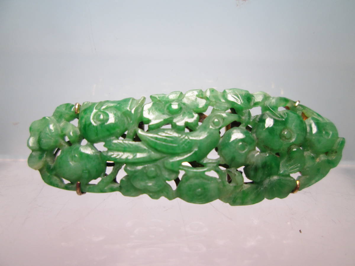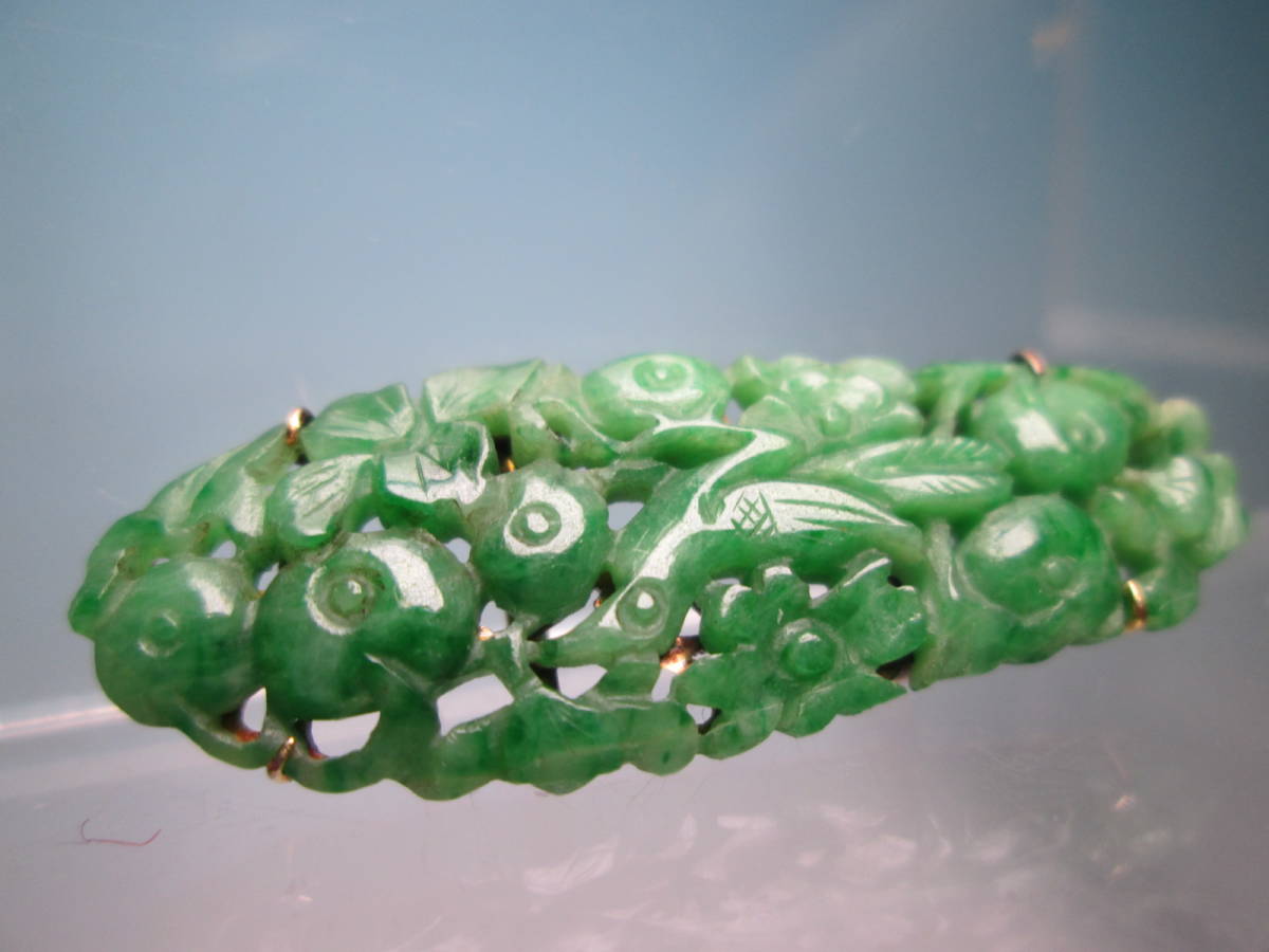 【江月】アンティーク・本翡翠 鳥に花と実透かし彫刻の帯留め 3,8g