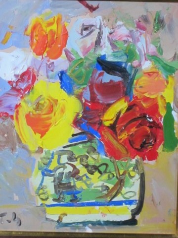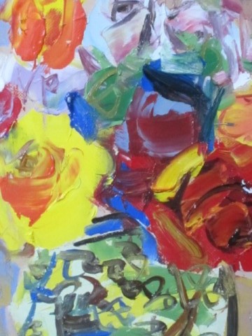 大胆な筆づかいで色鮮やかな大輪の薔薇を描いており、花瓶の重量感も感じられます。