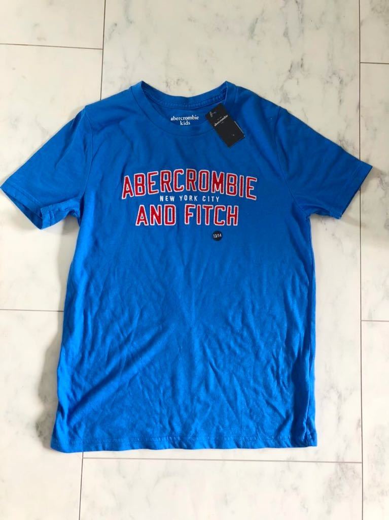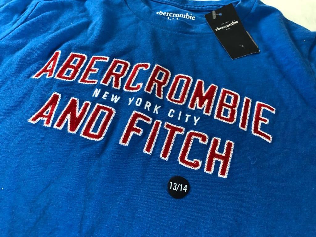 新品 Abercrombie & Fitch アバクロ アバクロンビー&フィッチ キッズ 子供 Tシャツ 13/14 ブルー 刺繍 Uネック 140 150