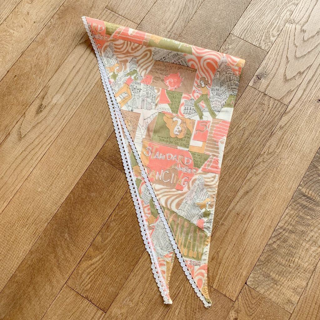 80年代当時の物です。ふちにレースが施された、サテン生地のサイケデリック柄です。スカーフやカバンのアクセントによさそうです。