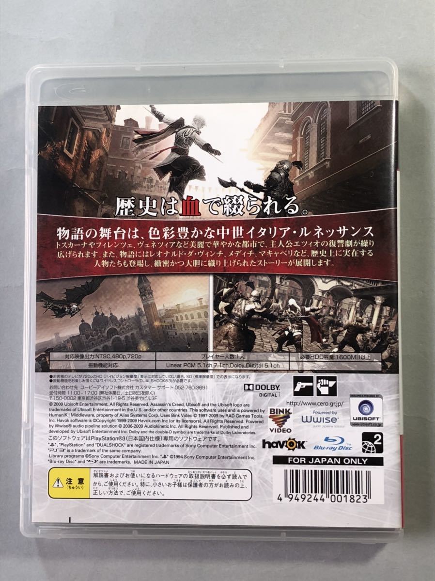 PS3ソフト アサシンクリードⅡ 「歴史は血で綴られる。」UBIソフトです。ケースの紙ジャケット裏に細かなシミ、飛沫が少しだけあります。ディスクのデータ読み取り面きれいです。起動、動作確認済みです。写真のモノが全てです。新品をお探しの方や神経質な方の入札はご遠慮下さい。ノークレーム・ノーリターンで、お願いします。入札よろしくお願いいたします。 C01-113-070302