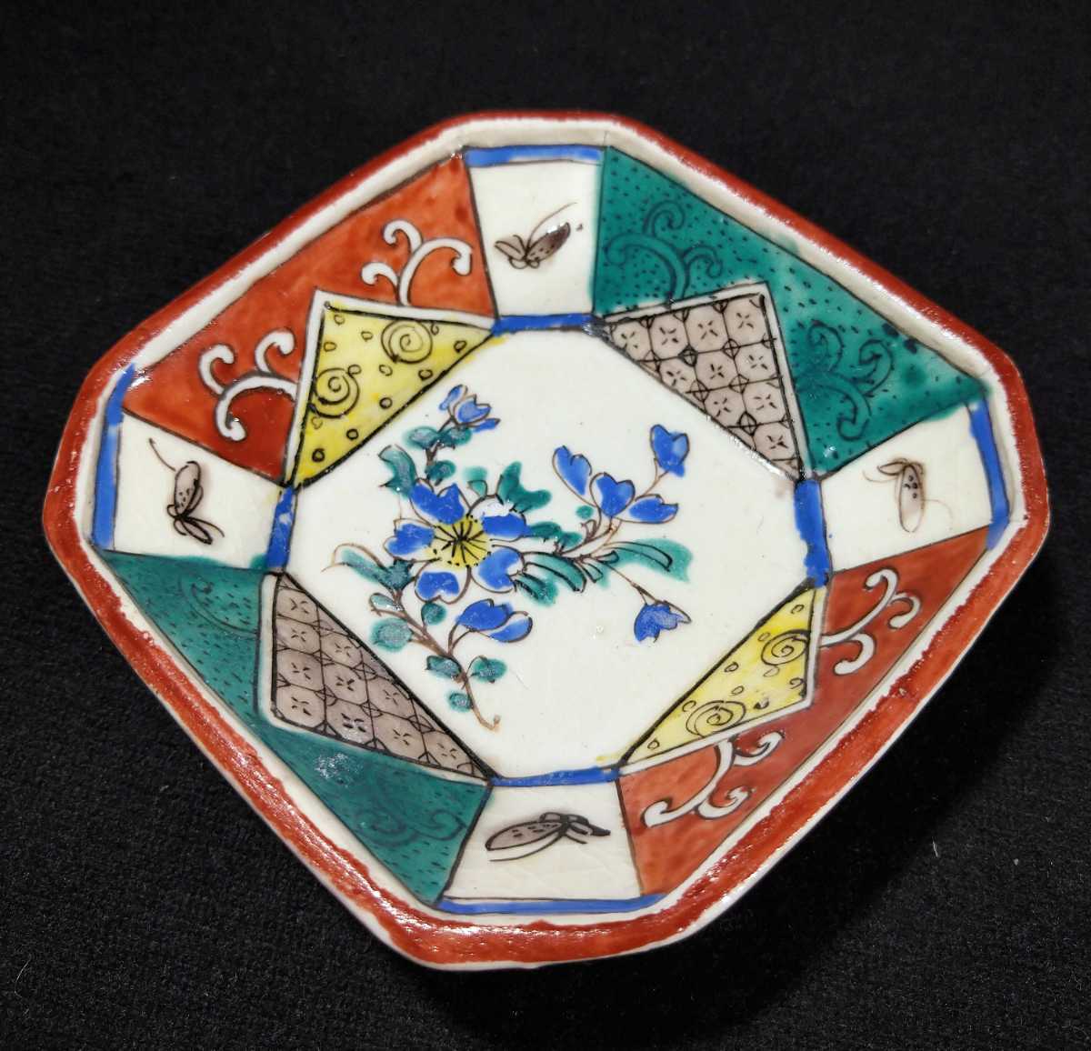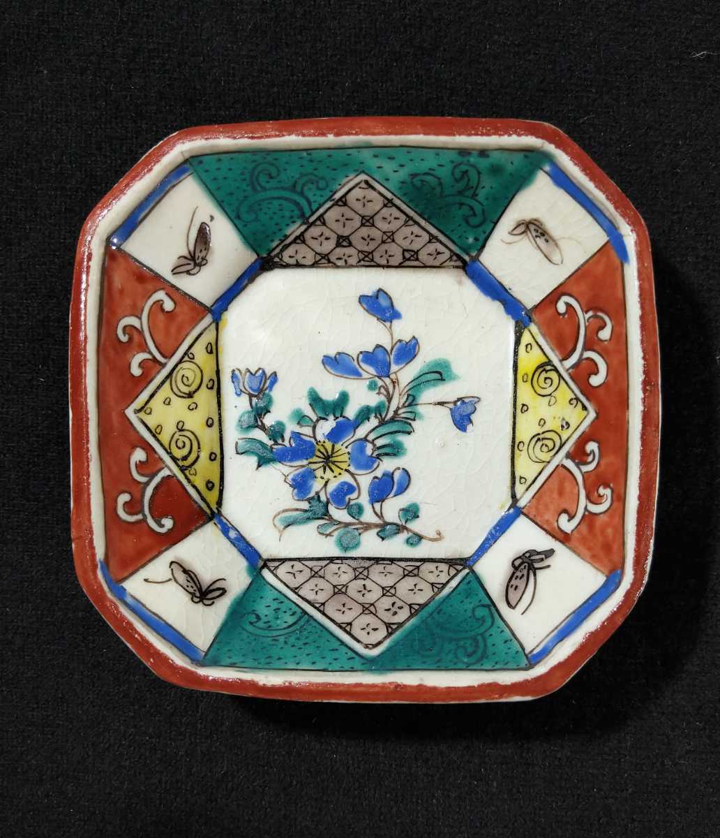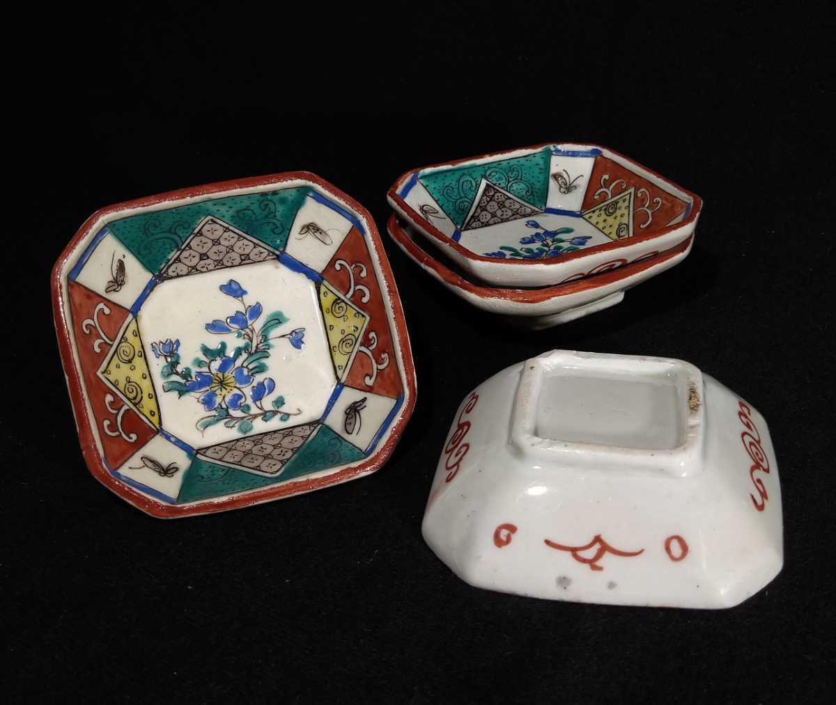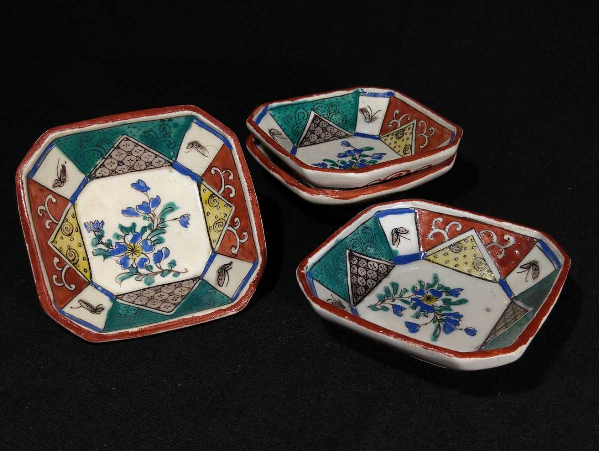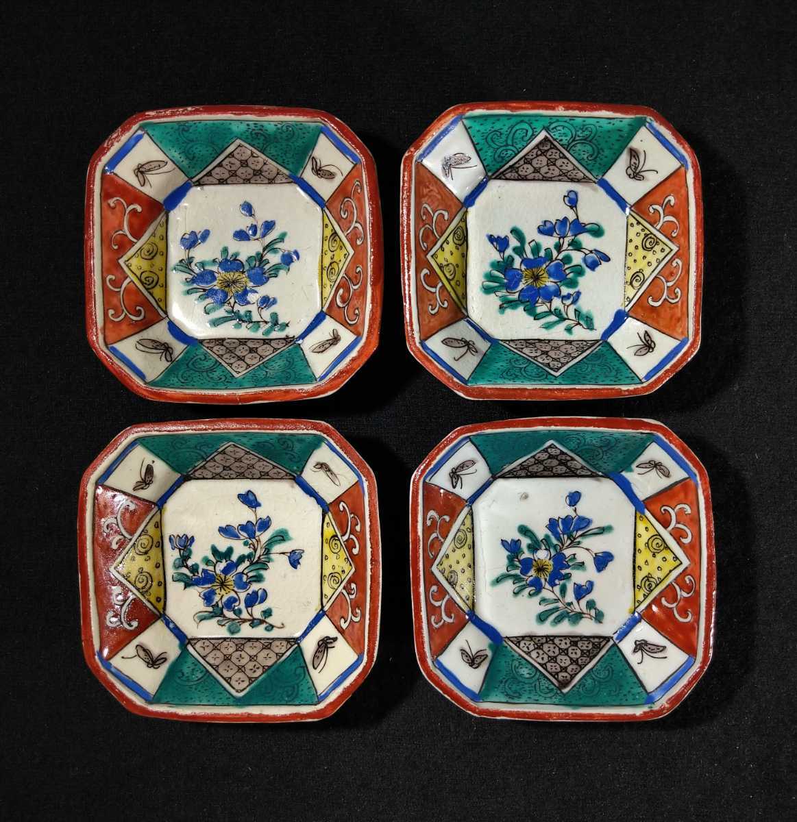 中央に花、角に蝶を配した美しい小皿4客組でございます。全体的にニュウがございます。1客口縁部に窯出しの際のものと思われる小さなニュウ、1客台部分に小さなカケ、1客に小さなカケ、1客にニュウがございます。