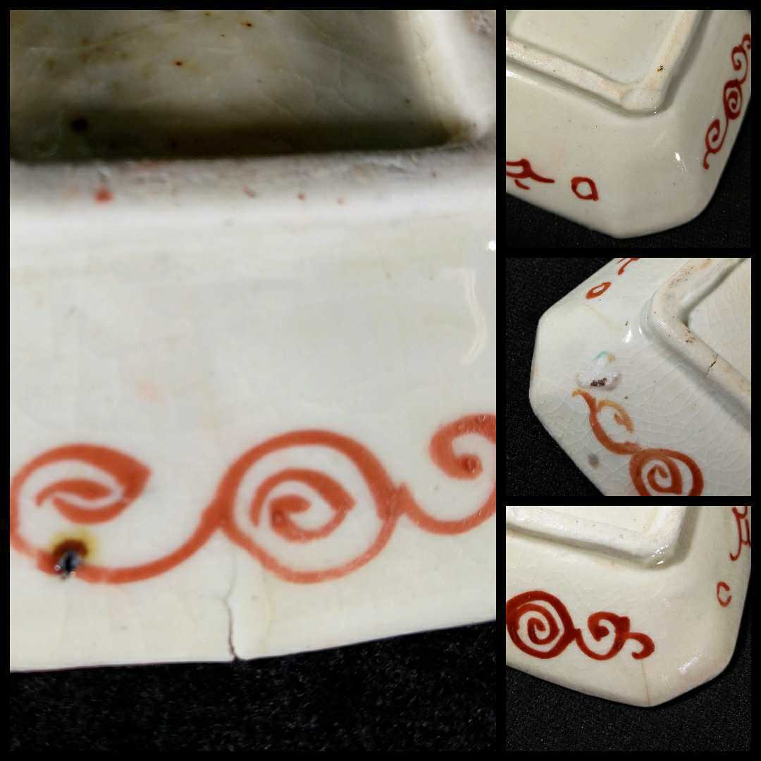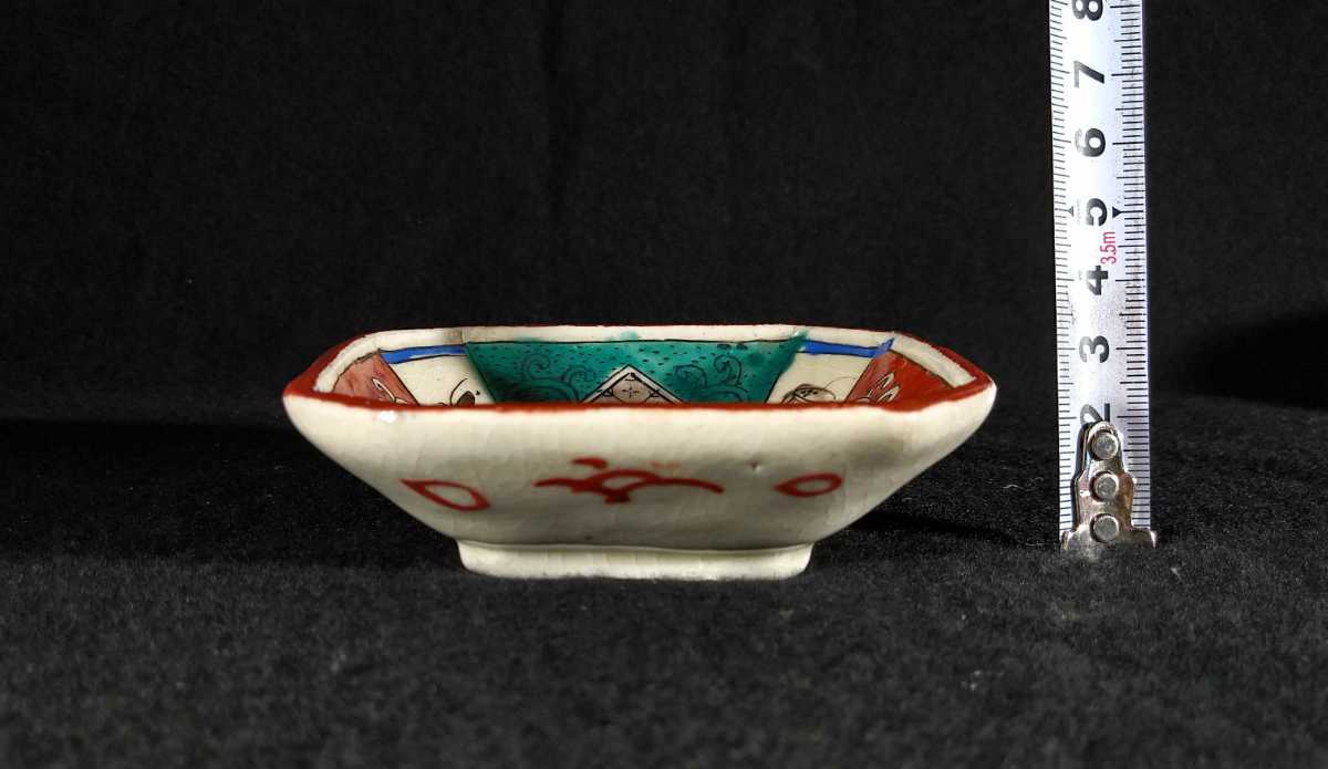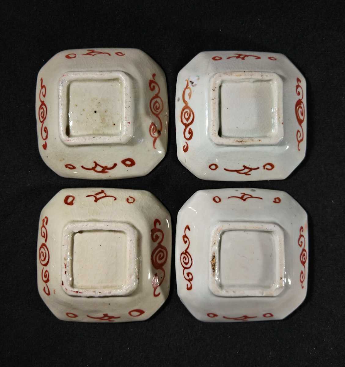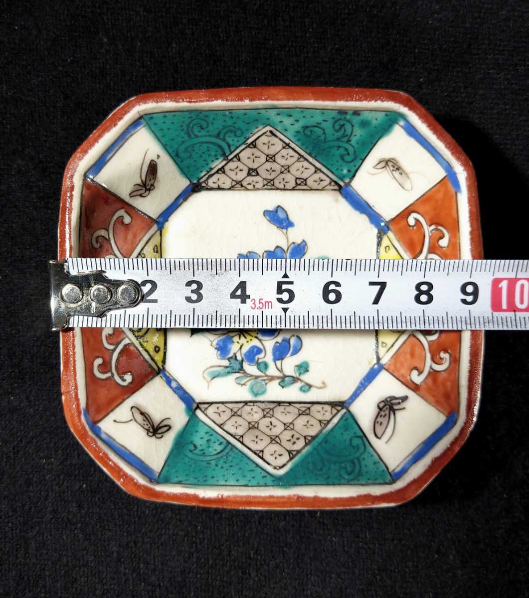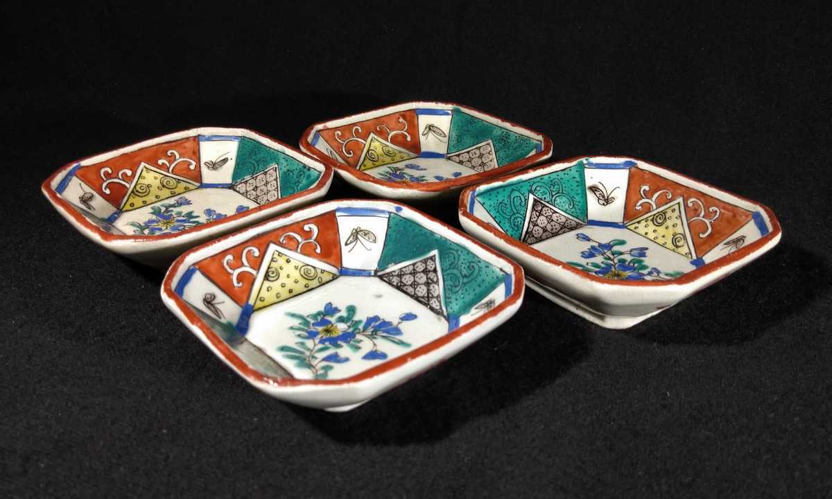中央に花、角に蝶を配した美しい小皿4客組でございます。全体的にニュウがございます。1客口縁部に窯出しの際のものと思われる小さなニュウ、1客台部分に小さなカケ、1客に小さなカケ、1客にニュウがございます。