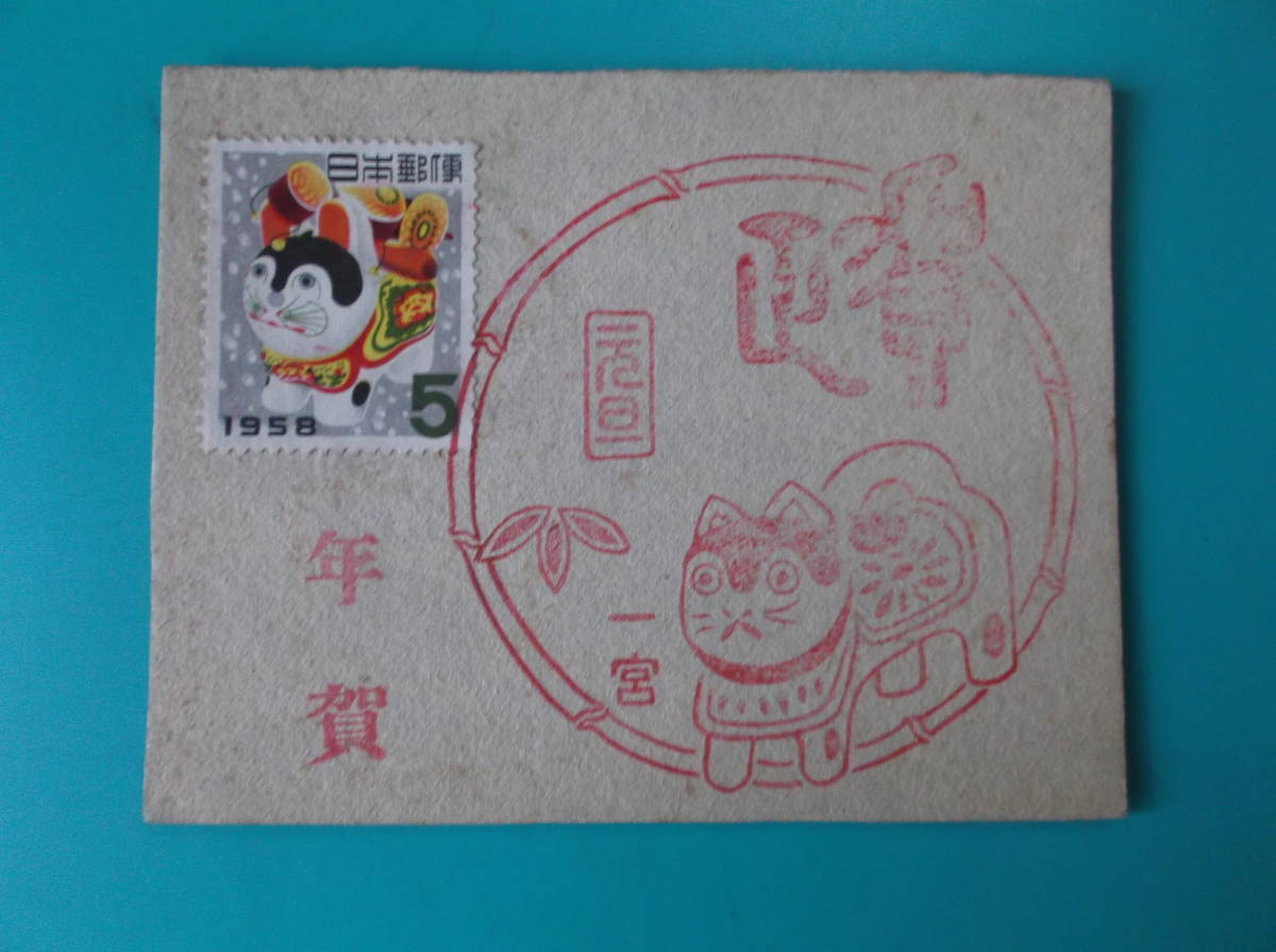 ⑧    昭和33年年賀切手犬はりこ  5円  一宮 賀正 元旦 大型印