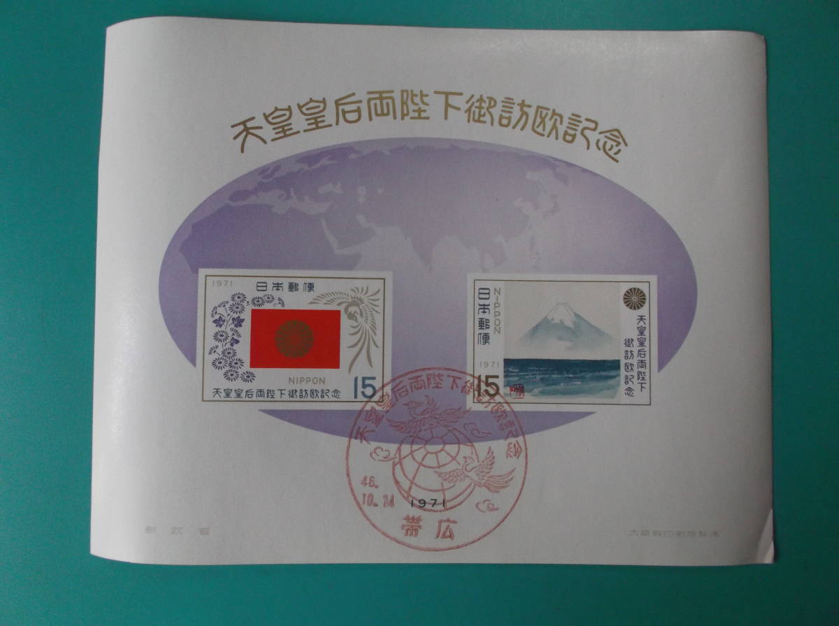 ⑨    天皇皇后両陛下御訪欧記念切手小型シート  15円2種  帯広郵便局記念印 昭和46年10月14日