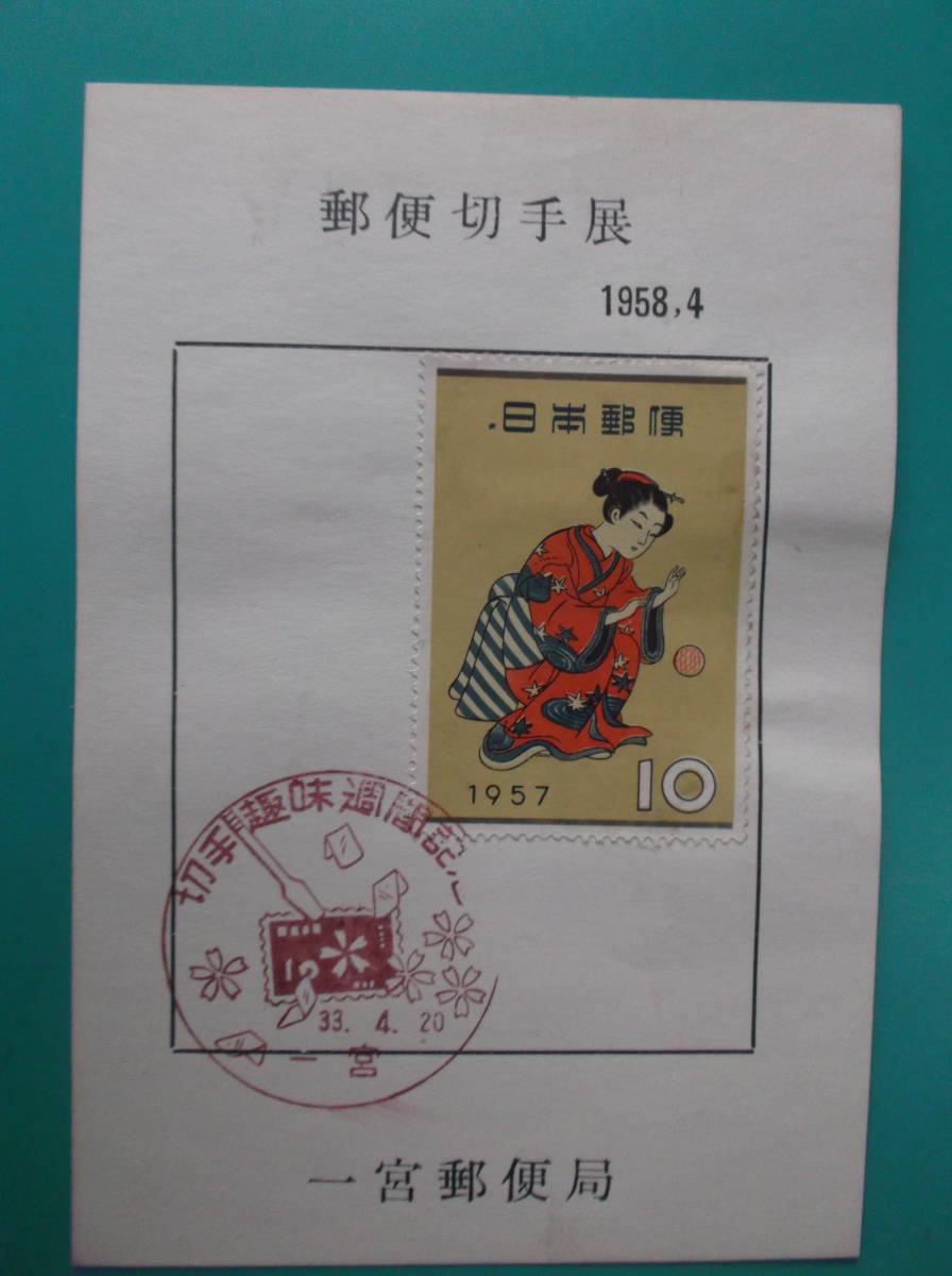 ②    まりつき切手趣味週間 10円  切手趣味週間記念印 一宮郵便局 昭和33年4月20日  郵便切手帳台紙