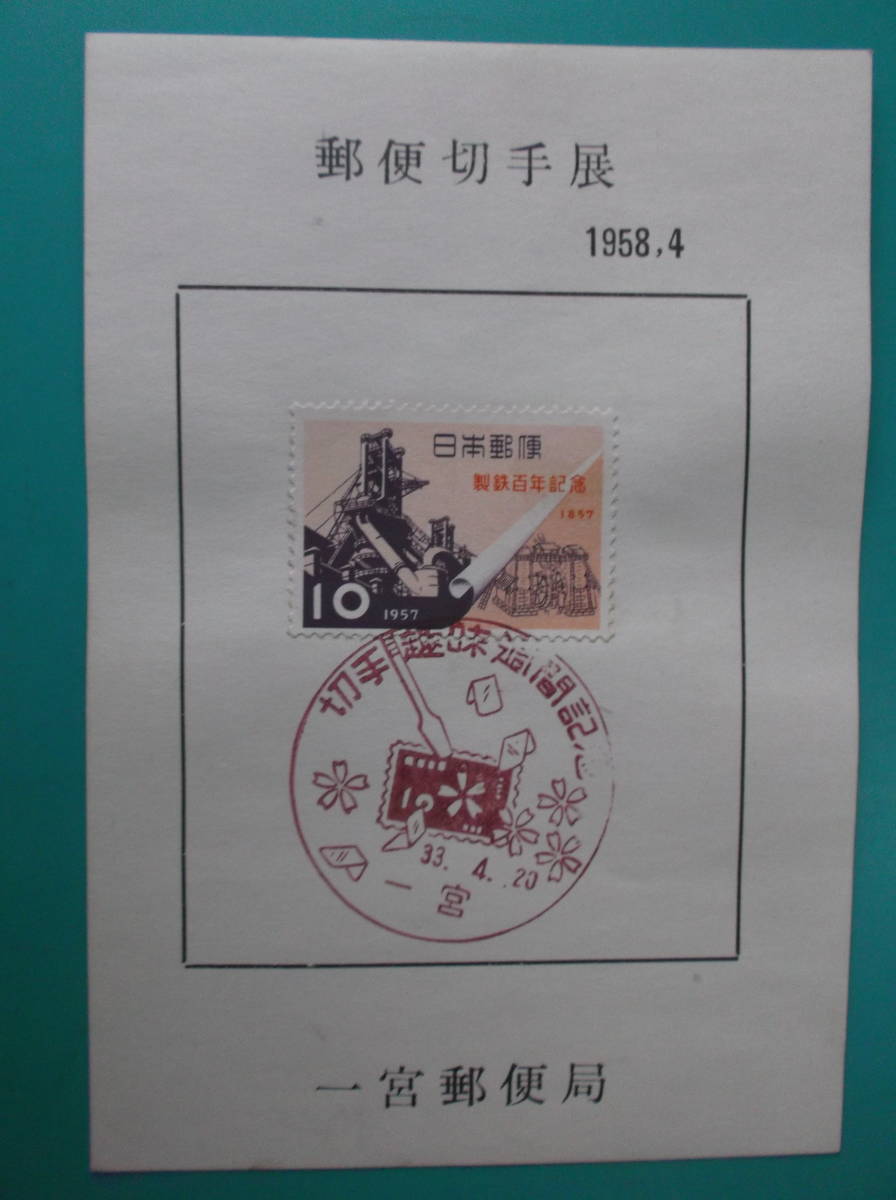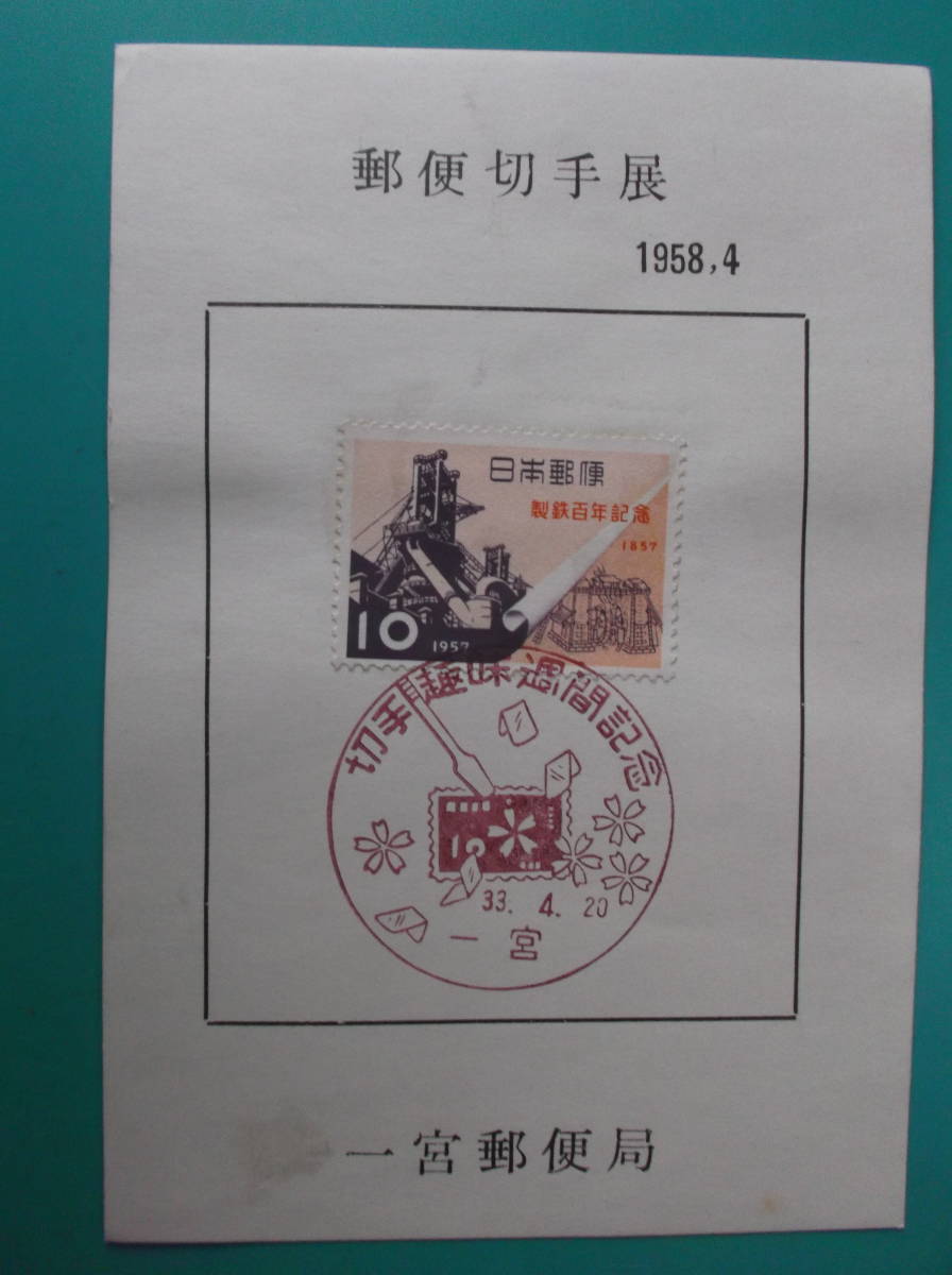 ⑦    製鉄100年  10円   切手趣味週間記念印 一宮郵便局 昭和33年4月20日  郵便切手帳台紙  B