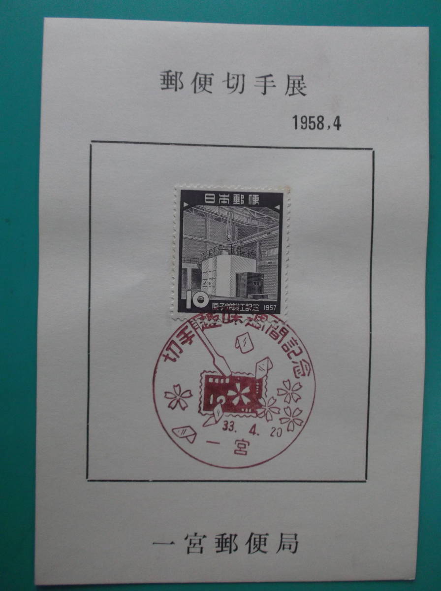 ④    原子炉竣工  10円  切手趣味週間記念印 一宮郵便局 昭和33年4月20日  郵便切手帳台紙