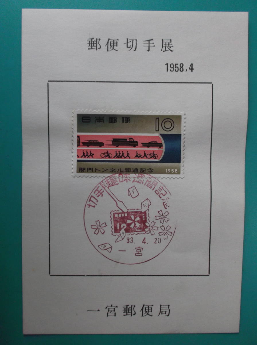 ⑤    関門トンネル  10円  切手趣味週間記念印 一宮郵便局 昭和33年4月20日  郵便切手帳台紙