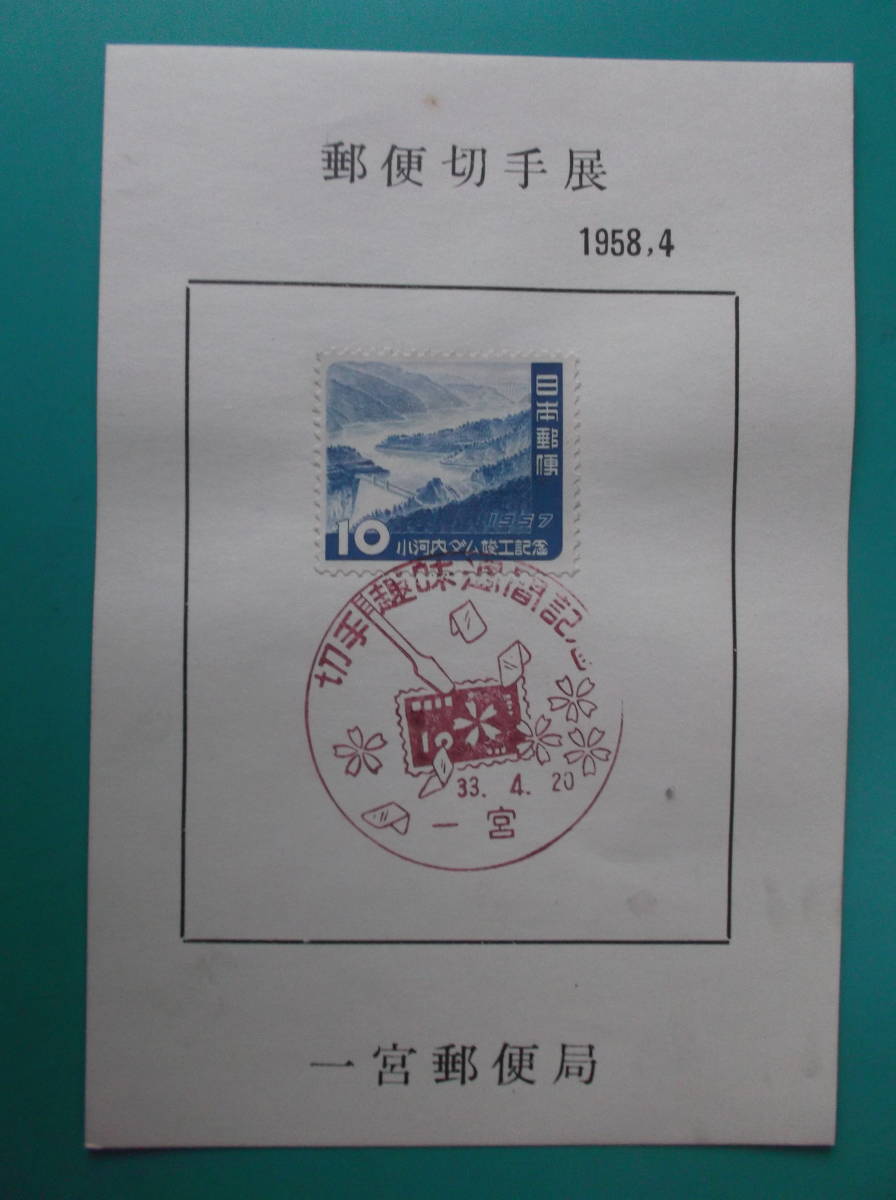 ⑥    小河内ダム  10円  切手趣味週間記念印 一宮郵便局 昭和33年4月20日  郵便切手帳台紙