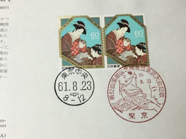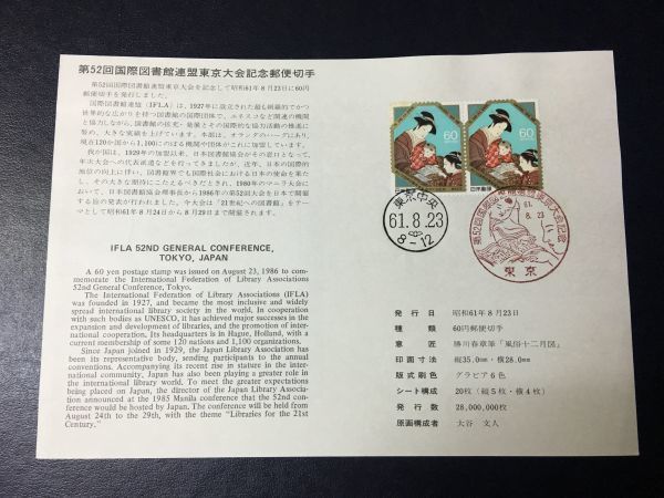 6454郵政省1986第53回国際図書館連盟東京大会記念切手解説書東京61.8.23初日印切手FDC初日記念カバー記念印切手使用済切手勉強切手即決切手