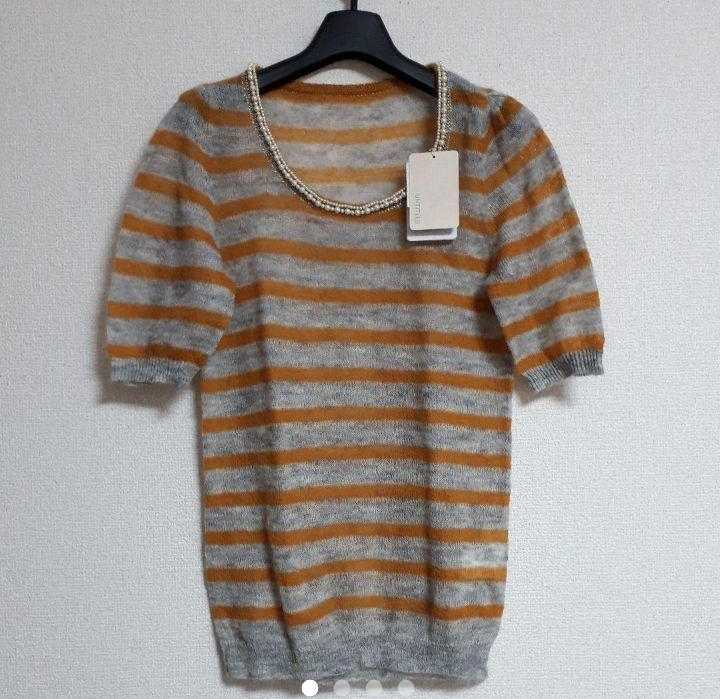 モヘヤ混でフワッとした素材、裏地なしで透けます。ネック回りにビジュー付きで可愛いです(*^^*)伸縮性のあるニットで着やすそうです。