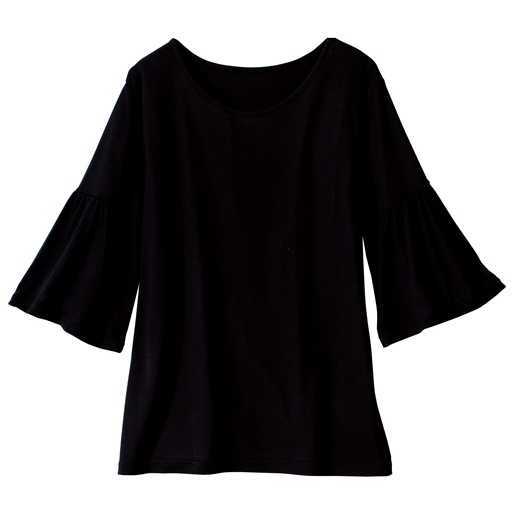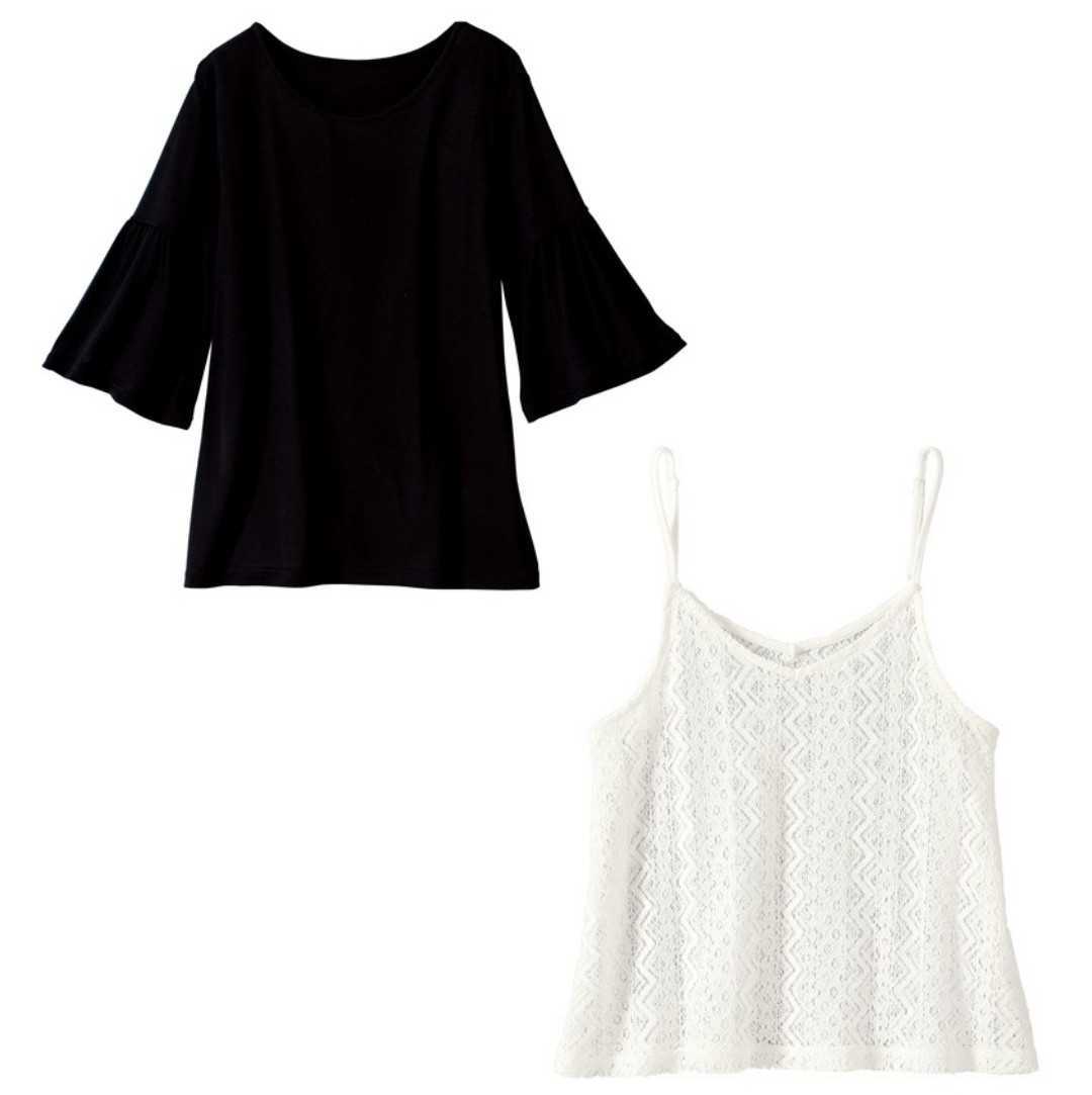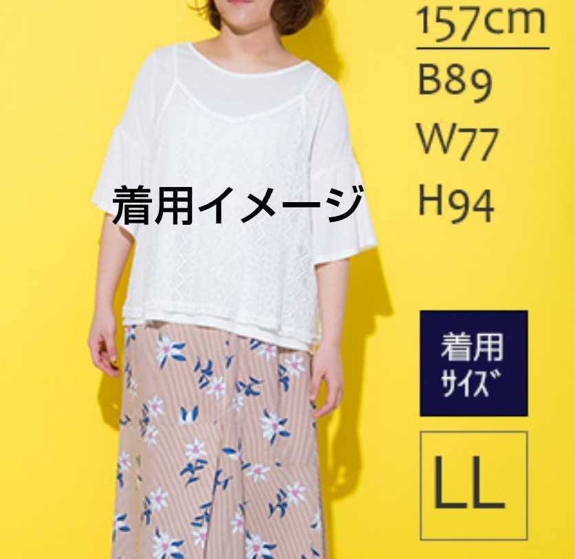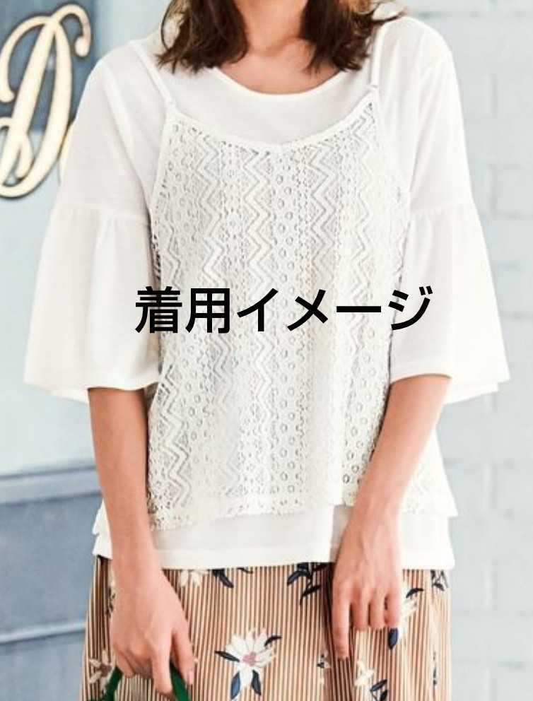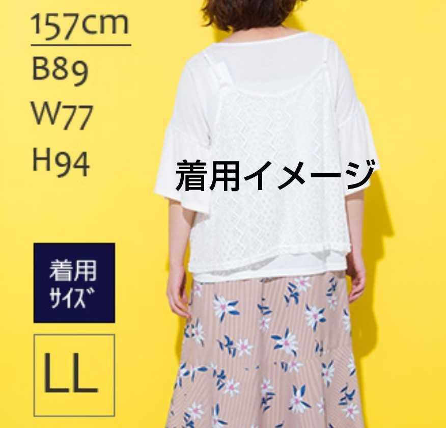 フリル袖カットソー & キャミソール (カットソー: ポリエステル65%、レーヨン35%(天竺)、キャミソール: 綿 79%、ナイロン 21%(レース)) 4Lサイズ(仕上げ寸法(約): カットソー: バスト122cm、身丈61cm、肩幅40cm、袖丈34cm、キャミソール: バスト124cm、身丈56cm)、フリル付け部分ゴム仕様、キャミソール肩ひも調整可、新品、未使用です。