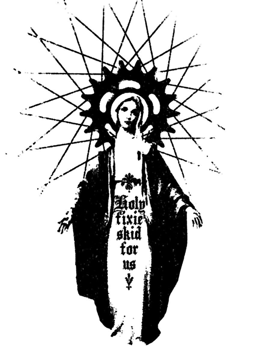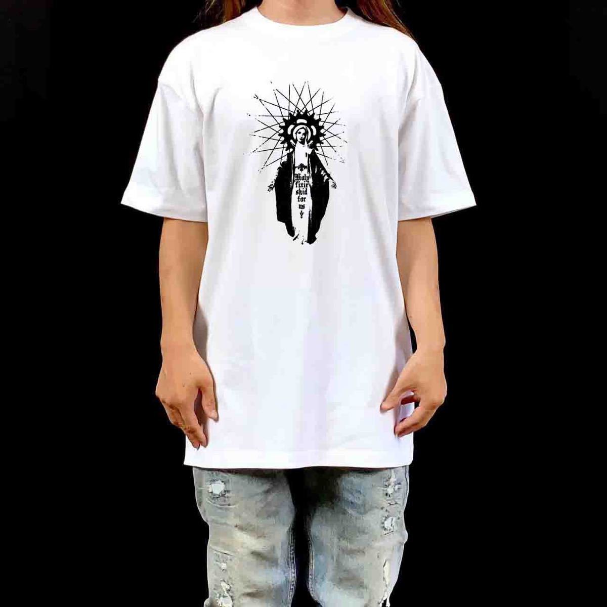 モノクロでシンプルに描かれたマリアのストリートグラフィティがロックなデザイン。