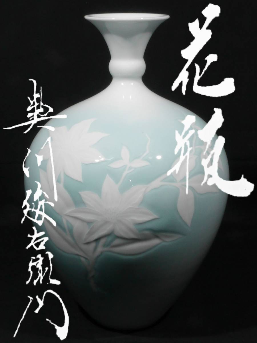 【値下げ交渉有り】 現代の名工 奥川俊右衛門 俊右エ門 造 青白磁 鉄仙花彫文 花入 花瓶 壺 共箱